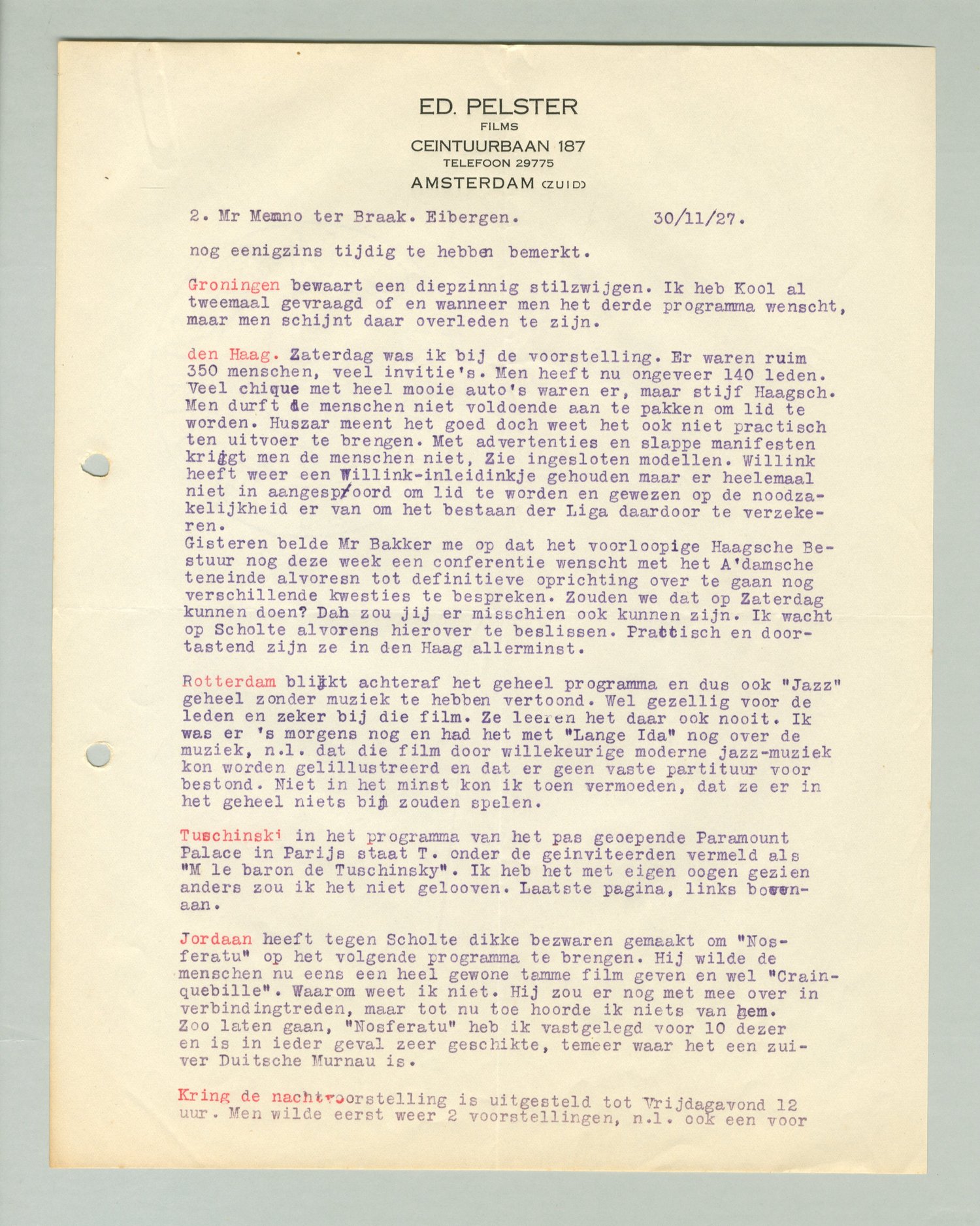 Jordaan heeft tegen Scholte dikke bezwaren gemaakt om Nosferatu op het volgende programma te brengen. Hij wilde de menschen nu eens een heel gewone tamme film geven en wel Crainquebille. Waarom weet ik niet. Hij zou er nog met me over in verbinding treden, maar tot nu toe hoorde ik niets van hem. Zoo laten gaan, Nosferatu heb ik vastgelegd voor 10 dezer en is in ieder geval zeer geschikt, temeer waar het een zuiver Duitsche Murnau is.