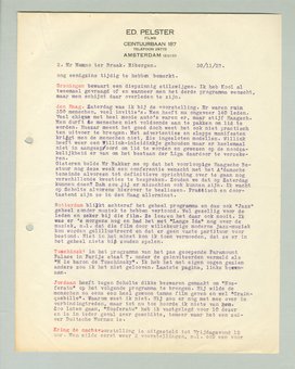 Utrecht's houding was me Maandagavond reeds bekend door een briefkaart, die me door mijn vrouw werd nagetelefoneerd, en waarop van Ravesteyn kort en goed mededeelde, dat men dat programma maar niet zou draaien en het ook reeds had teruggezonden. (Tot op heden heb ik de films echter nog niet ontvangen). Toevallig ontmoette ik Maandagavond Scholte en Ivens nog, die ik van de zaak op de hoogte stelde. Ook zij waren het er natuurlijk allesbehalve mee eens. Joris ging Dinsdag naar Utrecht en zou met van Ravesteyn gaan praten. Ook Scholte was gisteren avond naar Utrecht voor een critiek, doch weet ik niet of hij kans zou hebben van R. te treffen. Nu is het nog te vroeg om hem te bereiken en ook Joris is nog onbereikbaar zoodat ik geen definitief resultaat van hun pogingen weet. Het is anders een funest optreden op deze wijze, dat een eenigszins redelijke exploitatiemogelijkheid van de afdeelingen ineens radicaal zou kunnen nekken. Terwijl ik bovendien tegenover Paramount een figuur sla, die volgens recht en billijkheid toch het programma zouden mogen berekenen, omdat men het nu eenmaal gereserveerd en verzonden had. Gelukkig heb ik met hen nog geen ‘endgültige’ conditie's gemaakt, om de eenvoudige reden, dat ik persoonlijk de afdeelingen allerminst vertrouw, doch is dit zeer late afbestellen wel zeer in ons nadeel. Films zijn geen speelgoed of een boek, dat even geleend wordt. Weet ik meer over Utrecht dan schrijf ik het nog even. Ik voor mij neem aan, dat ze schichtig geworden zijn door de minder gunstige critieken over Jazz.