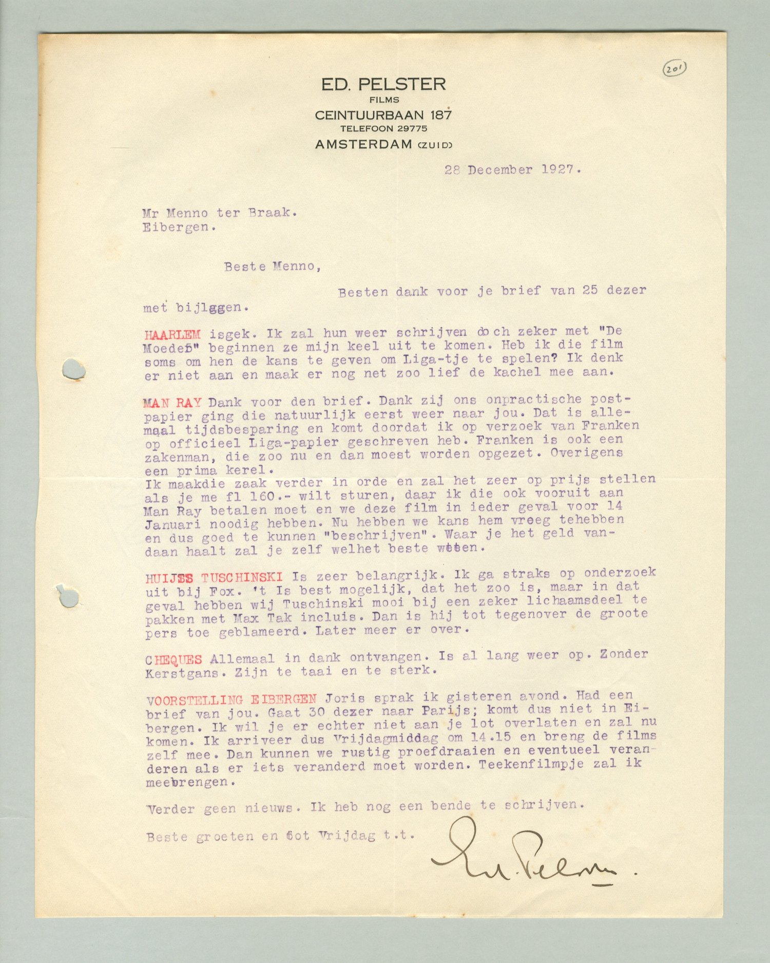 Ik maak die zaak verder in orde en zal het zeer op prijs stellen als je me fl160.- wilt sturen, daar ik die ook vooruit aan Man Ray betalen moet en we deze film in ieder geval voor 14 Januari noodig hebben. Nu hebben we kans hem vroeg te hebben en dus goed te kunnen ‘beschrijven’. Waar je het geld vandaan haalt zal je zelf wel het beste weten.