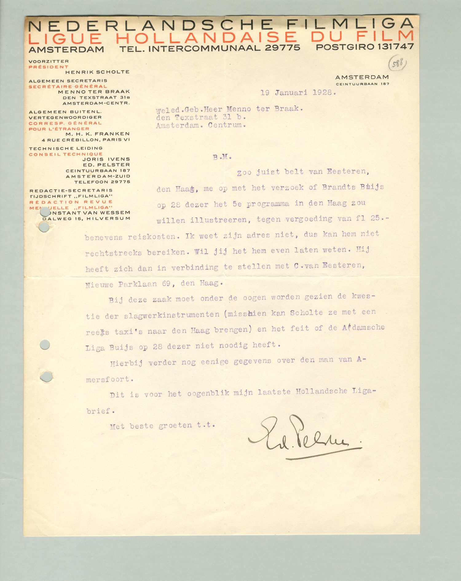 Zoo juist belt van Eesteren, den Haag, me op met het verzoek of Brandts Buijs op 28 dezer het 5e programma in den Haag zou willen illustreeren, tegen vergoeding van fl 25.- benevens reiskosten. Ik weet zijn adres niet, dus kan hem niet rechtstreeks bereiken. Wil jij het hem even laten weten. Hij heeft zich dan in verbinding te stellen met C. van Eesteren, Nieuwe Parklaan 69, den Haag.