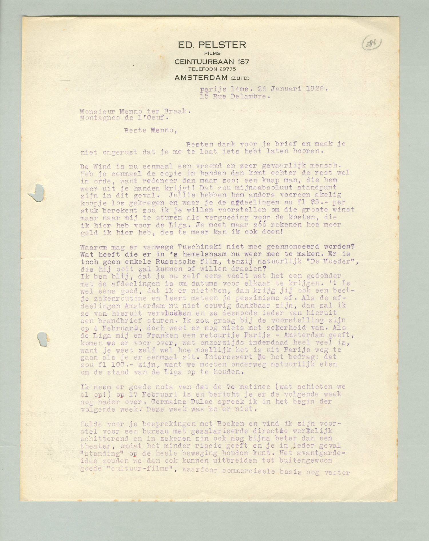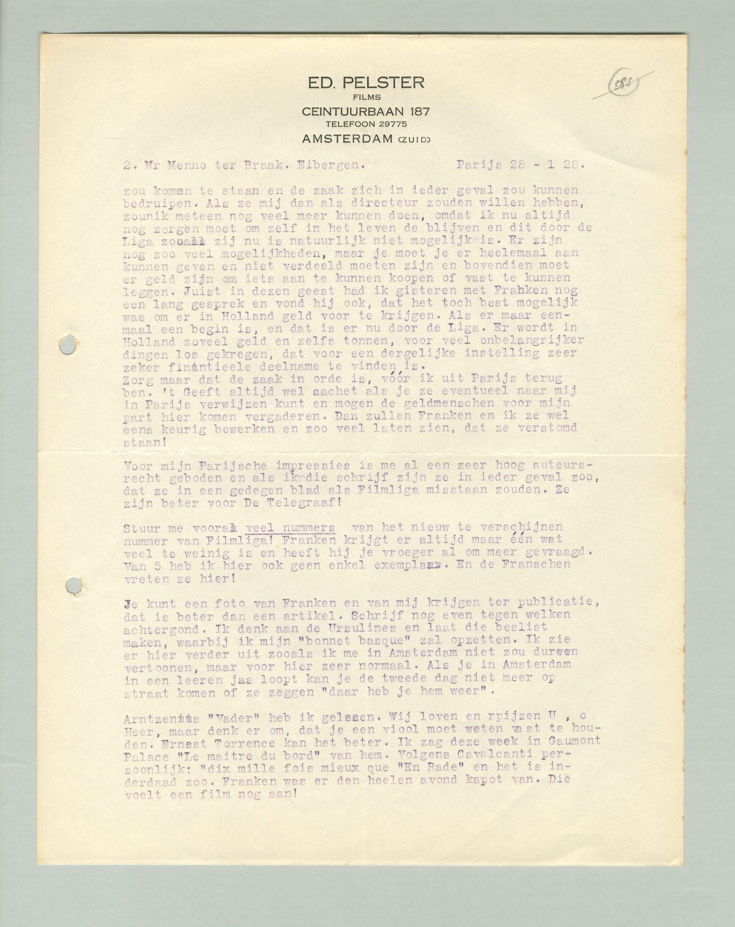Zorg maar dat de zaak in orde is, vóór ik uit Parijs terug ben. 't Geeft altijd wel cachet als je ze eventueel naar mij in Parijs verwijzen kunt en mogen de geldmenschen voor mijn part hier komen vergaderen. Dan zullen Franken en ik ze wel eens keurig bewerken en zoo veel laten zien, dat ze verstomd staan! Voor mijn Parijsche impressies is me al een zeer hoog auteursrecht geboden en als ik die schrijf zijn ze in ieder geval zoo, dat ze in een gedegen blad als Filmliga misstaan zouden. Ze zijn beter voor De Telegraaf!
