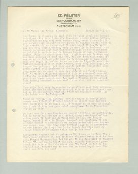 Hulde voor je besprekingen met Boeken en vind ik zijn voorstel voor een bureau met gesalarieerde directie werkelijk schitterend en in zekeren zin ook nog bijna beter dan een theater omdat het minder risico geeft en je in ieder geval ‘standing’ op de heele beweging houden kunt. Het avantgarde-idee zouden we dan ook kunnen uitbreiden tot buitengewoon goede ‘cultuur-films’, waardoor commercieele basis nog vaster zou komen te staan en de zaak zich in ieder geval zou kunnen bedruipen. Als ze mij dan als directeur zouden willen hebben, zou ik meteen nog veel meer kunnen doen, omdat ik nu altijd nog zorgen moet om zelf in het leven te blijven en dit door de Liga zooals zij nu is natuurlijk niet mogelijk is. Er zijn nog zoo veel mogelijkheden, maar je moet je er heelemaal aan kunnen geven en niet verdeeld moeten zijn en bovendien moet er geld zijn om iets aan te kunnen koopen of vast te kunnen leggen. Juist in dezen geest had ik gisteren met Franken nog een lang gesprek en vond hij ook, dat het toch best mogelijk was om er in Holland geld voor te krijgen. Als er maar eenmaal een begin is, en dat is er nu door de Liga. Er wordt in Holland zooveel geld en zelfs tonnen, voor veel onbelangrijker dingen los gekregen, dat voor een dergelijke instelling zeer zeker finantieele deelname te vinden is.