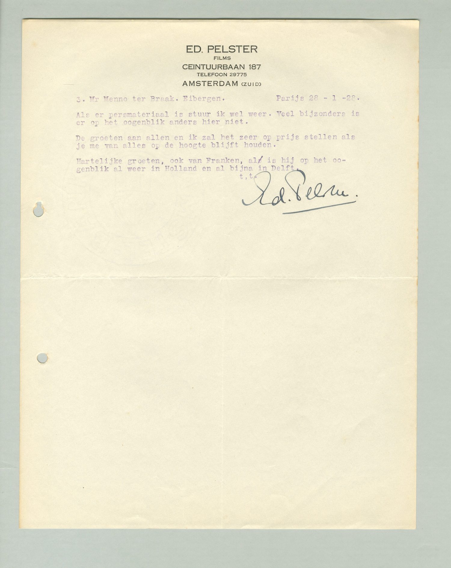 Stuur me vooral veel nummers van het nieuw te verschijnen nummer van Filmliga: Franken krijgt er altijd maar één wat veel te weinig is en heeft hij je vroeger al om meer gevraagd. Van 5 heb ik hier ook geen enkel exemplaar. En de Franschen vreten ze hier! Je kunt een foto van Franken en van mij krijgen ter publicatie, dat is beter dan een artikel. Schrijf nog even tegen welken achtergrond. Ik denk aan de Ursilines en laat die beslist maken, waarbij ik mijn ‘bonnet basque’ zal opzetten. Ik zie er hier verder uit zooals ik me in Amsterdam niet zou durven vertoonen, maar voor hier zeer normaal. Als je in Amsterdam in een leeren jas loopt kan je de tweede dag niet meer op straat komen of ze zeggen ‘daar heb je hem weer’.