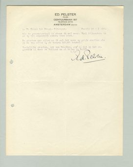 Besten dank voor je brief en maak je niet ongerust dat je me te laat iets hebt laten hooren. De Wind is nu eenmaal een vreemd en zeer gevaarlijk mensch. Heb je eenmaal de copie in handen dan komt echter de rest wel in orde, want redeneer dan maar zoo: een knap man, die hem weer uit je handen krijgt! Dat zou mijn absoluut standpunt zijn in dit geval. Jullie hebben hem anders voor een akelig koopje los gekregen en waar je de afdeelingen nu fl 75.- per stuk berekent zou ik je willen voorstellen om die groote winst maar naar mij te sturen als vergoeding voor de kosten, die ik hier heb voor de Liga. Je moet maar zoo rekenen hoe meer geld ik hier heb, des te meer kan ik ook doen!