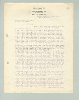 Ik ben blij, dat je nu zelf eens voelt wat het een gedonder met de afdeelingen is om datums voor elkaar te krijgen. 't Is wel eens goed, dat ik er niet ben, dan krijg jij ook een beetje zakenroutine en leert meteen je pessimisme af. Als de afdeelingen Amsterdam nu niet eeuwig dankbaar zijn, dan zal ik ze van hieruit vervloeken en ze desnoods ieder van hieruit een brandbrief sturen. Ik zou graag bij de voorstelling zijn op 4 Februari, doch weet er nog niets met zekerheid van. Als de Liga mij en Franken een retourtje Parijs-Amsterdam geeft, komen we er voor over, wat onzerzijds inderdaad heel veel is, want je weet zelf wel hoe moeilijk het is uit Parijs weg te gaan als je er eenmaal zit. Interesseert je het bedrag: dat zou fl 100.- zijn, want we moeten onderweg natuurlijk eten om de stand van de Liga op te houden.