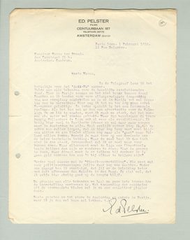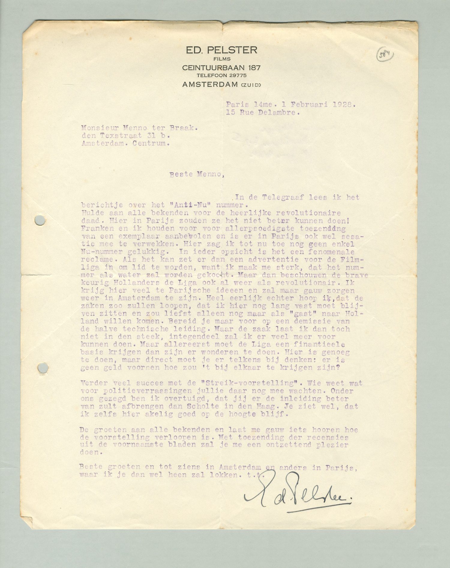 In de Telegraaf lees ik het berichtje over het ‘Anti-Nu’ nummer. Hulde aan alle bekenden voor de heerlijke revolutionaire daad. Hier in Parijs zouden ze het niet beter kunnen doen! Franken en ik houden ons voor allerspoedigste toezending van een exemplaar aanbevolen en is er in Parijs ook wel sensatie mee te verwekken. Hier zag ik tot nu toe nog geen enkel Nu-nummer gelukkig. In ieder opzicht is het een fenomenale reclame. Als het kan zet er dan een advertentie voor de Filmliga in om lid te worden, want ik maak me sterk, dat het nummer als water zal worden gekocht. Maar dan beschouwen de brave keurige Hollanders de Liga ook al weer als revolutionair. Ik krijg hier veel te Parijsche ideeen en zal maar gauw zorgen weer in Amsterdam te zijn. Heel eerlijk echter hoop ik, dat de zaken zoo zullen loonen, dat ik hier nog lang vast moet blijven zitten en zou liefst alleen nog maar als ‘gast’ naar Holland willen komen. Bereid je maar voor op een demissie van de halve technische leiding. Maar de zaak laat ik dan toch niet in den steek, integendeel zal ik er veel meer voor kunnen doen. Maar allereerst moet de Liga een finantieele basis krijgen dan zijn er wonderen te doen. Hier is genoeg te doen, maar direct moet je er telkens bij denken: er is geen geld voor en hoe zou 't bij elkaar te krijgen zijn?