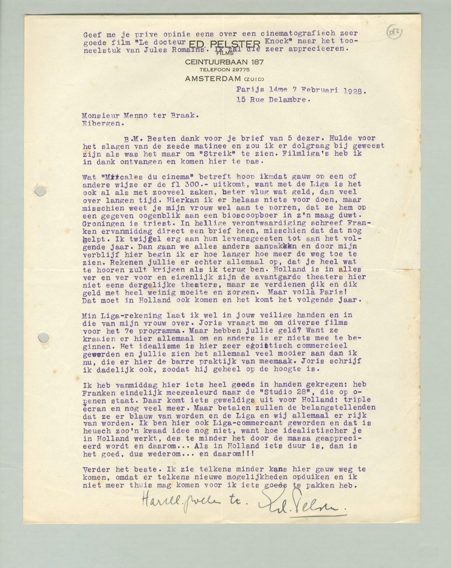 Groningen is triest. In heilige verontwaardiging schreef Franken er vanmiddag direct een brief heen, misschien dat dat nog helpt. Ik twijfel erg aan hun levensgeesten tot aan het volgende jaar. Dan gaan we alles anders aanpakken en door mijn verblijf hier begin ik er hoe langer hoe meer de weg toe te zien. Rekenen jullie er echter allemaal op, dat je heel wat te hooren zult krijgen als ik terug ben. Holland is in alles ver en ver voor en eigenlijk zijn de avantgarde theaters hier niet eens dergelijke theaters, maar ze verdienen dik en dik geld met heel weinig moeite en zorgen. Maar voilà Paris! Dat moet in Holland ook komen en het komt het volgende jaar. Mijn Liga-rekening laat ik wel in jouw veilige handen en in die van mijn vrouw over. Joris vraagt me om diverse films voor het 7e programma. Maar hebben jullie geld? Want ze kraaien er hier allemaal om en anders is er niets mee te beginnen. Het idealisme is hier zeer egoistisch commercieel geworden en jullie zien het allemaal nog veel mooier aan dan ik nu, die er hier de barre praktijk van meemaak. Joris schrijf ik dadelijk ook, zoodat hij geheel op de hoogte is.