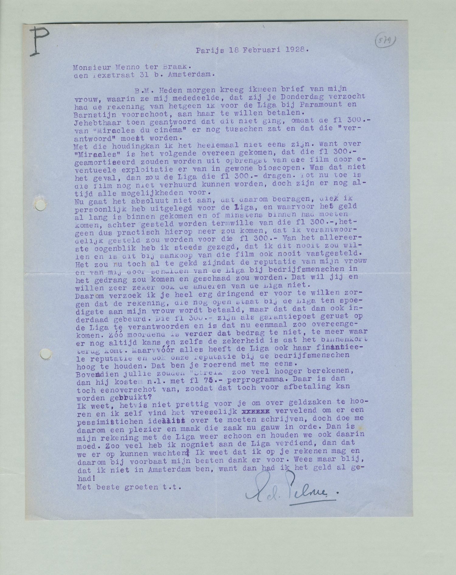 Hedenmorgen kreeg ik een brief van mijn vrouw, waarin ze mij mededeelde dat zij je Donderdag verzocht had de rekening van hetgeen ik voor de Liga bij Paramount en Barnstijn voorschoot, aan haar te willen betalen. Je hebt haar toen geantwoord dat dit niet ging, omdat de fl 300.- van Miracles du cinéma er nog tusschen zat en dat die ‘verantwoord’ moest worden.