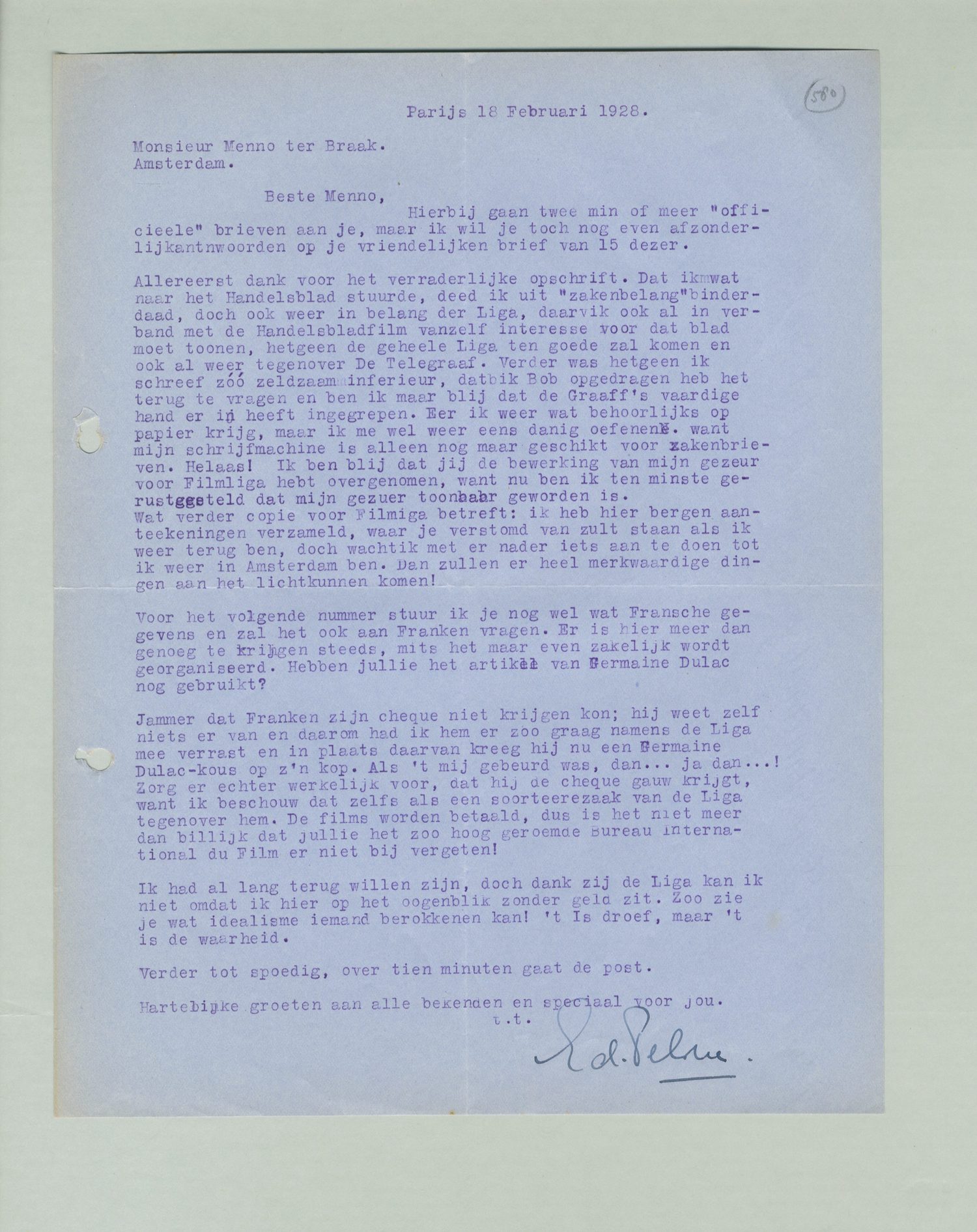 Jammer dat Franken zijn cheque niet krijgen kon; hij weet zelf niets er van en daarom had ik hem er zoo graag namens de Liga mee verrast en in plaats daarvan kreeg hij nu een Germaine Dulac-kous op z'n kop. Als 't mij gebeurd was, dan... ja dan...! Zorg er echter werkelijk voor, dat hij de cheque gauw krijgt, want ik beschouw dat zelfs als een soort eerezaak van de Liga tegenover hem. De films worden betaald, dus is het niet meer dan billijk dat jullie het zoo hoog geroemde Bureau International du Film er niet bij vergeten!
