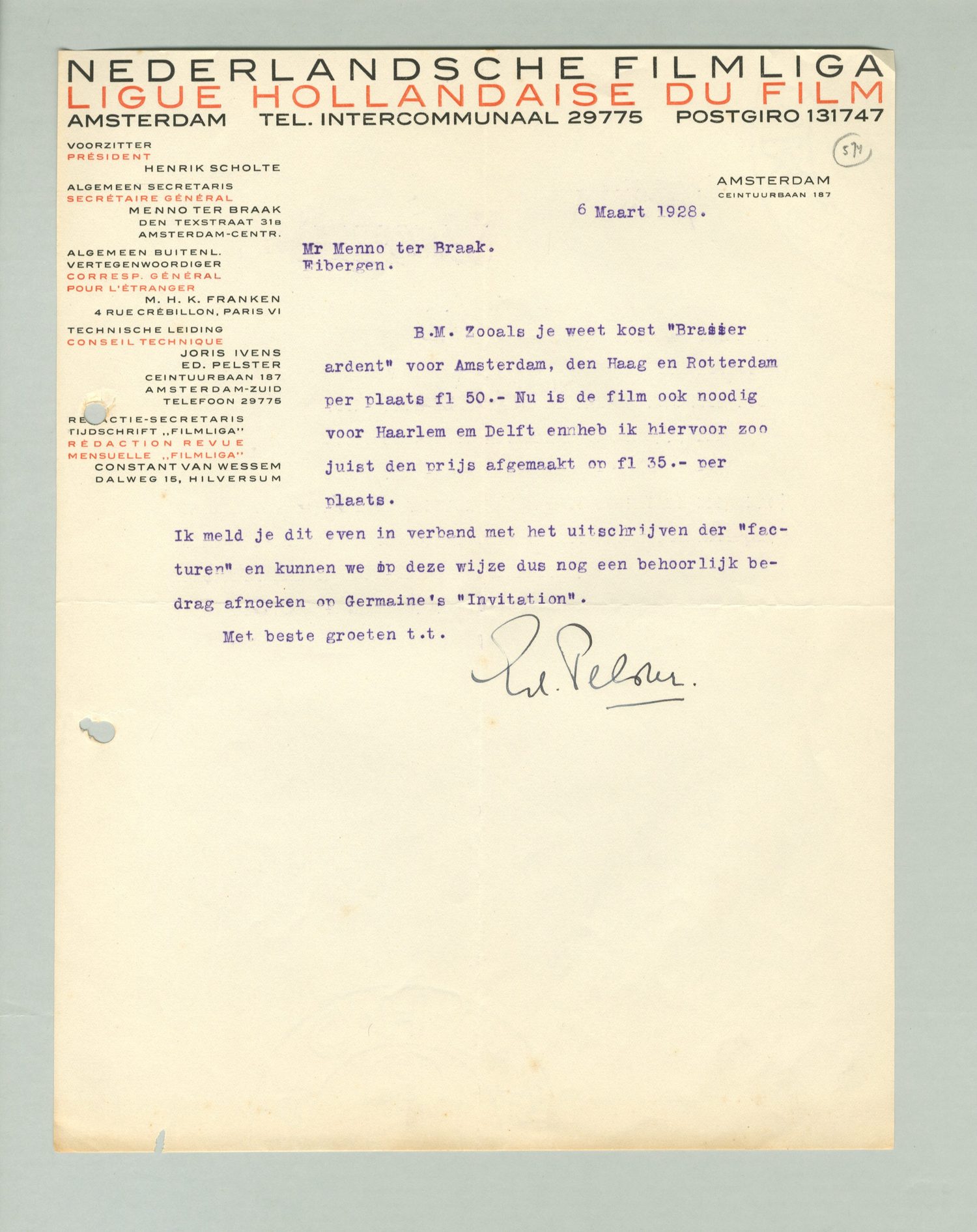 Zooals je weet kost Brasier ardent voor Amsterdam, den Haag en Rotterdam per plaats fl 50.- Nu is de film ook noodig voor Haarlem en Delft en heb ik daarvoor zoo juist den prijs afgemaakt op fl 35.- per plaats.