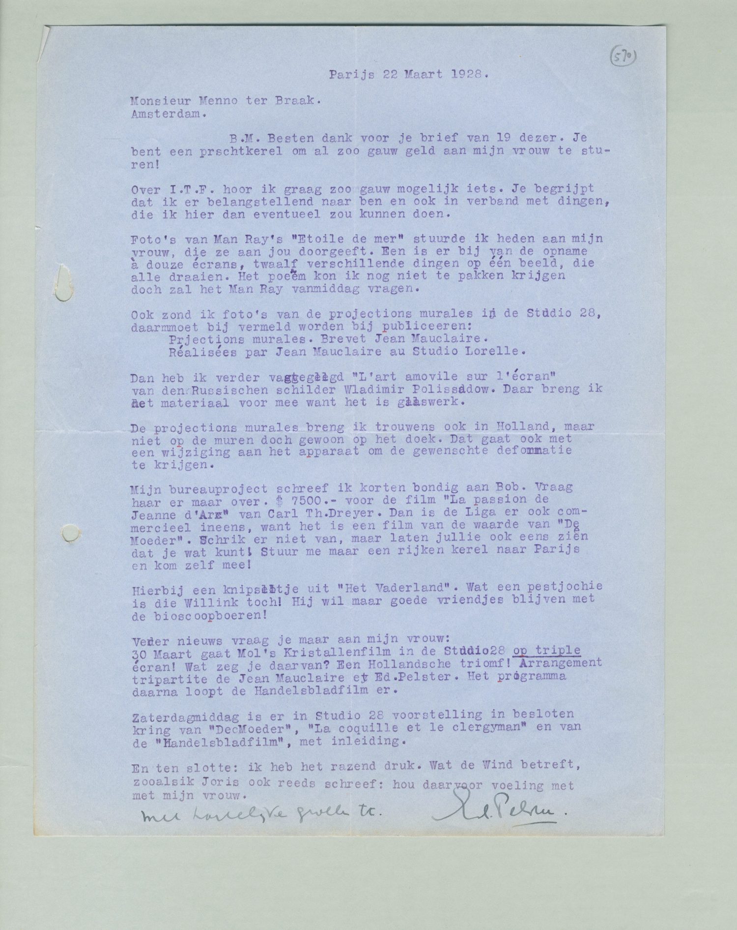 Foto's van Man Ray's Etoile de mer stuurde ik heden aan mijn vrouw, die ze aan jou doorgeeft. Een is er bij van de opname à douze écrans, twaalf verschillende dingen op één beeld, die alle draaien. Het poëem kon ik nog niet te pakken krijgen doch zal het Man Ray vanmiddag vragen.