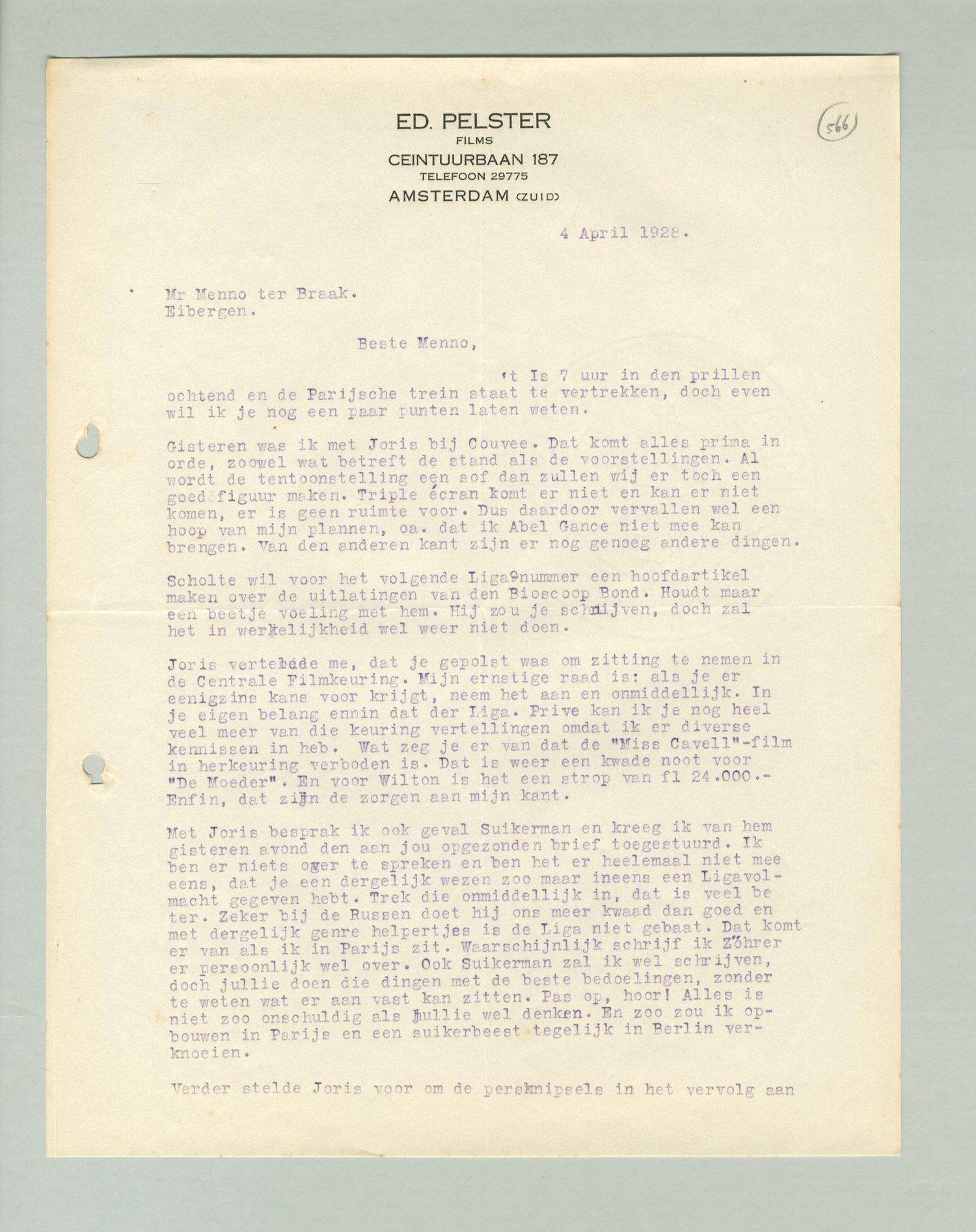 Joris vertelde me, dat je gepolst was om zitting te nemen in de Centrale Filmkeuring. Mijn ernstige raad is: als je er eenigszins kans voor krijgt, neem het aan en onmiddellijk. In je eigen belang en in dat der Liga. Prive kan ik je nog heel veel meer van die keuring vertellingen omdat ik er diverse kennissen in heb. Wat zeg je er van dat de Miss Cavell-film in herkeuring verboden is. Dat is weer een kwade noot voor De Moeder. En voor Wilton is het een strop van fl 24.000.- Enfin, dat zijn de zorgen aan mijn kant.