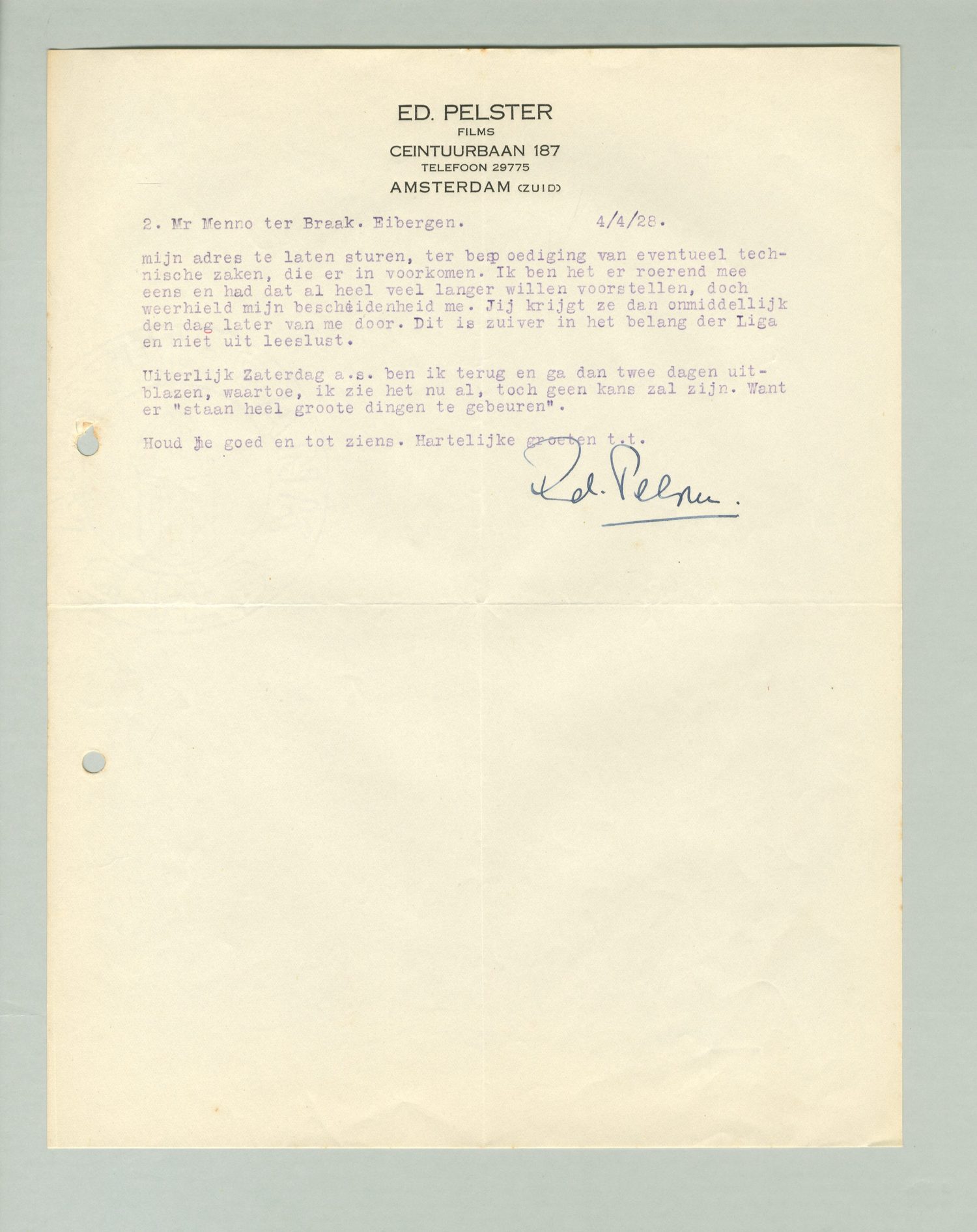 Scholte wil voor het volgende Liganummer een hoofdartikel maken over de uitlatingen van den Bioscoop Bond. Houdt maar een beetje voeling met hem. Hij zou je schrijven, doch zal het in werkelijkheid wel weer niet doen.