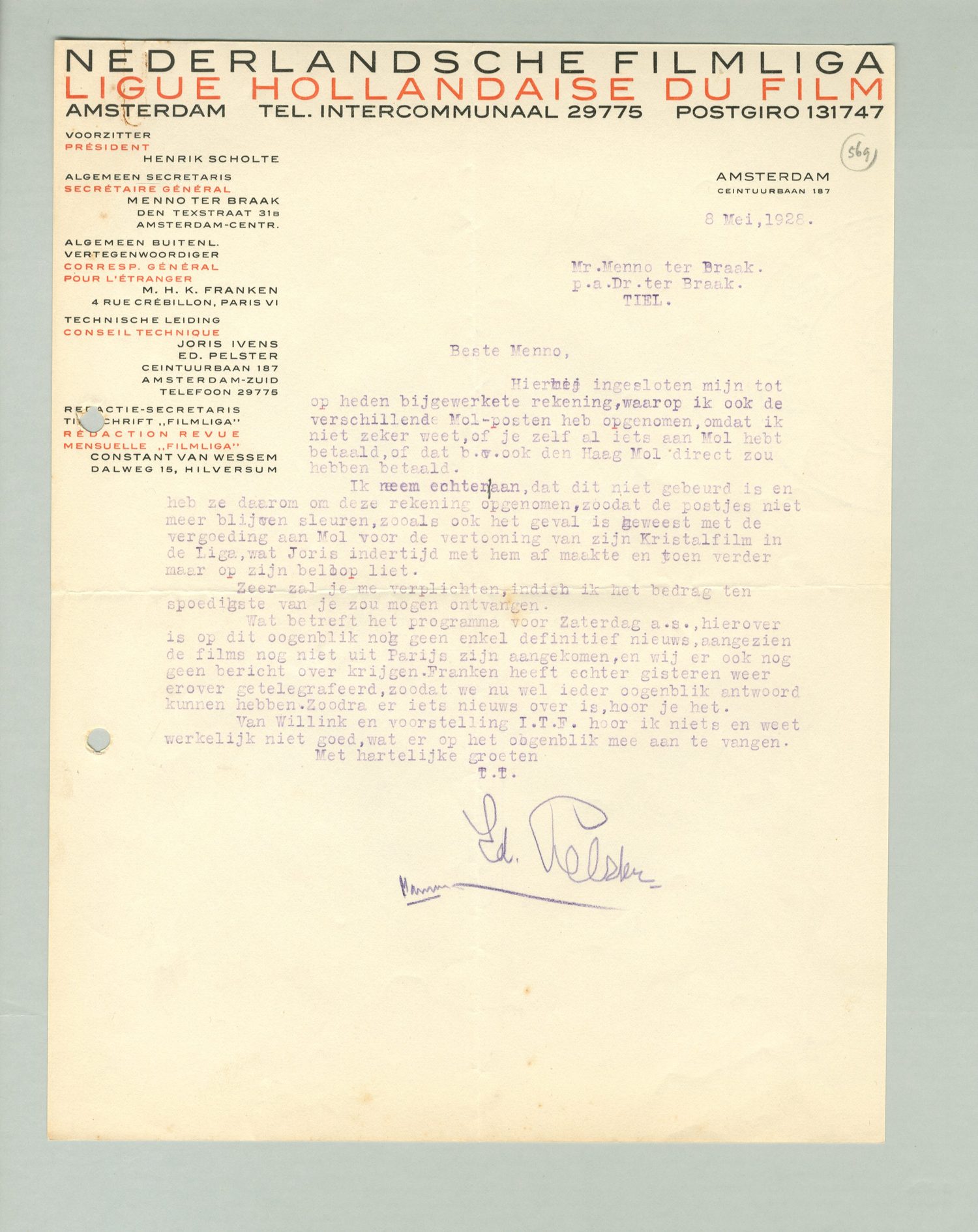 Ik neem echter aan, dat dit niet gebeurd is en heb ze daarom op deze rekening opgenomen, zoodat de postjes niet meer blijven sleuren, zooals ook het geval is geweest met de vergoeding aan Mol voor de vertooning van zijn Kristalfilm in de Liga, wat Joris indertijd met hem af maakte en toen verder maar op zijn beloop liet.