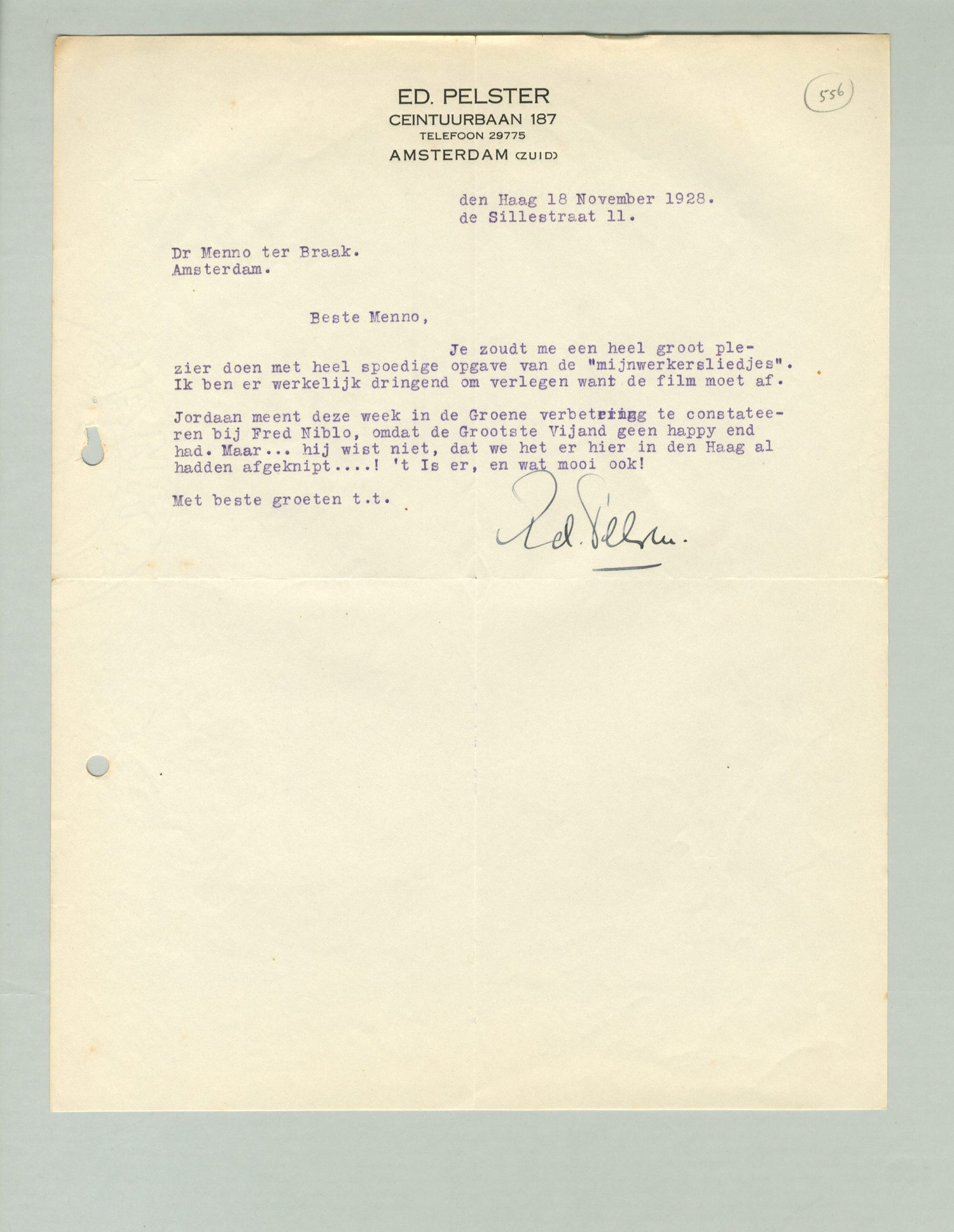 Je zoudt me een heel groot plezier doen met heel spoedige opgave van de ‘mijnwerkersliedjes’. Ik ben er werkelijk dringend om verlegen want de film moet af.