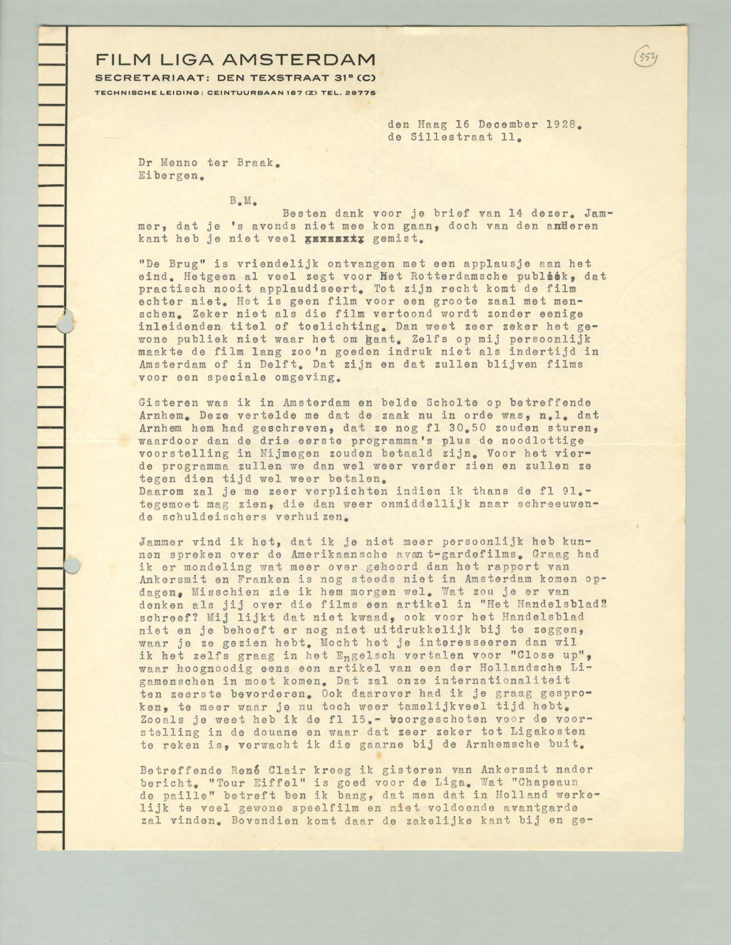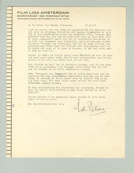Jammer vind ik het, dat ik je niet meer persoonlijk heb kunnen spreken over de Amerikaansche avant-gardefilms. Graag had ik er mondeling wat meer over gehoord dan het rapport van Ankersmit en Franken is nog steeds niet in Amsterdam komen opdagen. Misschien zie ik hem morgen wel. Wat zou je er van denken als jij over die films een artikel in Het Handelsblad schreef? Mij lijkt dat niet kwaad, ook voor het Handelsblad niet en je behoeft er nog niet nadrukkelijk bij te zeggen, waar je ze gezien hebt. Mocht het je interesseeren dan wil ik het zelfs graag in het Engelsch vertalen voor Close up, waar hoognoodig eens een artikel van een der Hollandsche Ligamenschen in moet komen. Dat zal onze internationaliteit ten zeerste bevorderen. Ook daarover had ik je graag gesproken, te meer waar je toch weer tamelijk veel tijd hebt. Zooals je weet heb ik de fl. 15.- voorgeschoten voor de voorstelling in de douane en waar dat zeer zeker tot Ligakosten te rekenen is, verwacht ik die gaarne bij de Arnhemsche buit.
