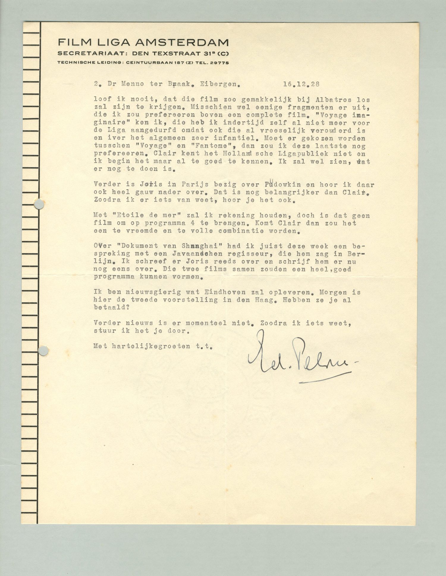 Betreffende René Clair kreeg ik gisteren van Ankersmit nader bericht. Tour Eiffel is goed voor de Liga. Wat Chapeau de paille betreft ben ik bang, dat men dat in Holland werkelijk te veel gewone speelfilm en niet voldoende avantgarde zal vinden. Bovendien komt daar de zakelijke kant bij en geloof ik nooit, dat die film zoo gemakkelijk bij Albatros los zal zijn te krijgen. Misschien wel eenige fragmenten er uit, die ik zou prefereeren boven een complete film. Voyage imaginaire ken ik, die heb ik indertijd zelf al niet meer voor de Liga aangedurfd omdat ook die al vreeselijk verouderd is en over het algemeen zeer infantiel. Moet er gekozen worden tusschen Voyage en Fantome, dan zou ik deze laatste nog prefereeren. Clair kent het Hollandsche Ligapubliek niet en ik begin het maar al te goed te kennen. Ik zal wel zien, wat er nog te doen is.