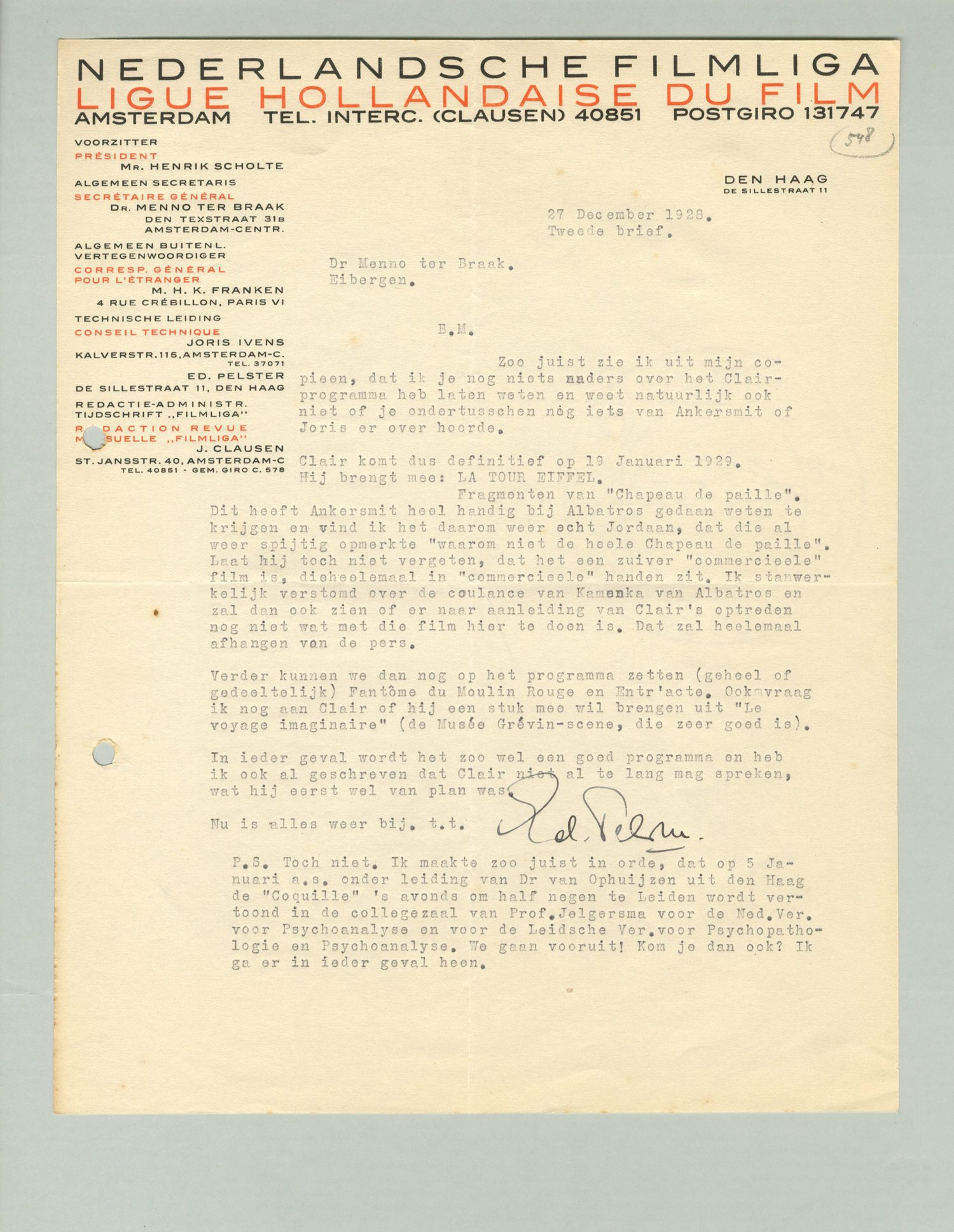 P.S. Toch niet. Ik maakte zoojuist in orde, dat op 5 Januari a.s. onder leiding van Dr. van Ophuijzen uit den Haag de Coquille 's avonds om half negen te Leiden wordt vertoond in de collegezaal van Prof. Jelgersma voor de Ned. Ver. voor Psychoanalyse en voor de Leidsche Ver. voor Psychopathologie en Psychoanalyse. We gaan vooruit! Kom je dan ook? Ik ga er in ieder geval heen.