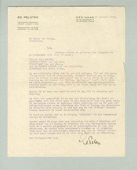 De verschillende films ben ik aan het najagen. Hin zal wel gaan. Hoogstraat heb ik aangevraagd. Halmen behoort aan de City, maar we hebben er nog geen copie van en prijs wordt de groote kwestie en het humeur van Wilton. Zuiderzee heeft Joris niet de volle beschikking over daar de Directie der Zuiderzeewerken rechten heeft op die film, doch is Dr Ivens bezig met hen te onderhandelen.