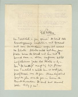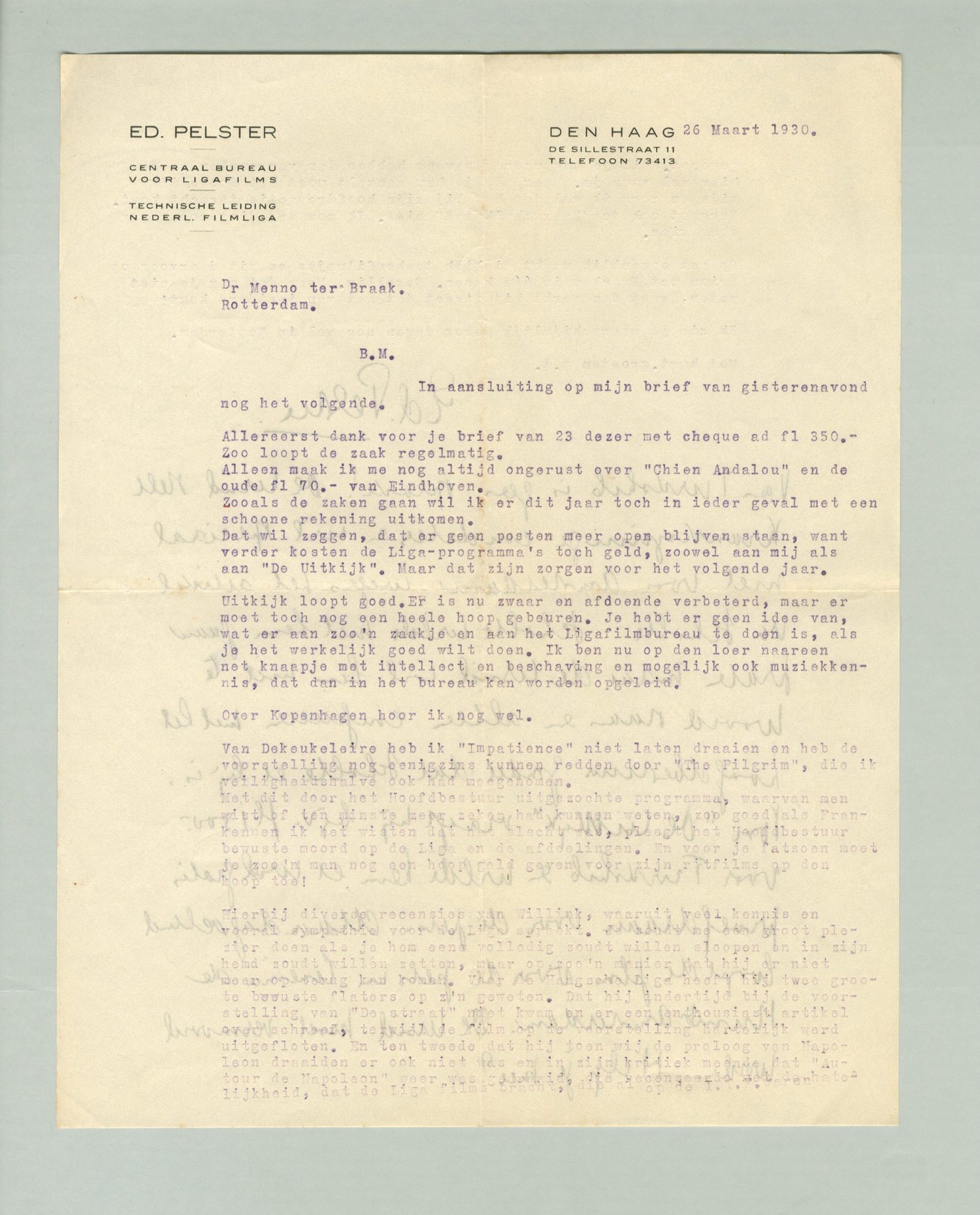 Hierbij diverse recensies van Willink, waaruit veel kennis en vooral sympathie voor de Liga spreekt. Je zou me een groot plezier doen als je hem eens volledig zoudt willen sloopen en in zijn hemd zoudt willen zetten, maar op zoo'n manier dat hij er niet meer op terug kan komen. Voor de Haagsche Lia heeft hij twee groote bewuste flaters op zijn geweten. Dat hij indertijd bij de voorstelling van De straat niet kwam en er een enthousiast artikel over schreef, terwijl de film op de voorstelling hartelijk werd uitgefloten. En ten tweede dat hij toen wij de proloog van Napoleon draaiden er ook niet was en in zijn kritiek meende, dat Autour de Napoleon [onleesbaar]. Wil je nog meer gegevens hebben dan verzamelen we ze hier wel voor je. Maar als je hem aanvalt moet het doodelijk zijn en zorg ik wel dat het bij zijn hoofdredactie terecht komt. Vergeet ook de ‘Maarschalkstaf’ niet. Ik zou dat ding zoo graag eens zien.