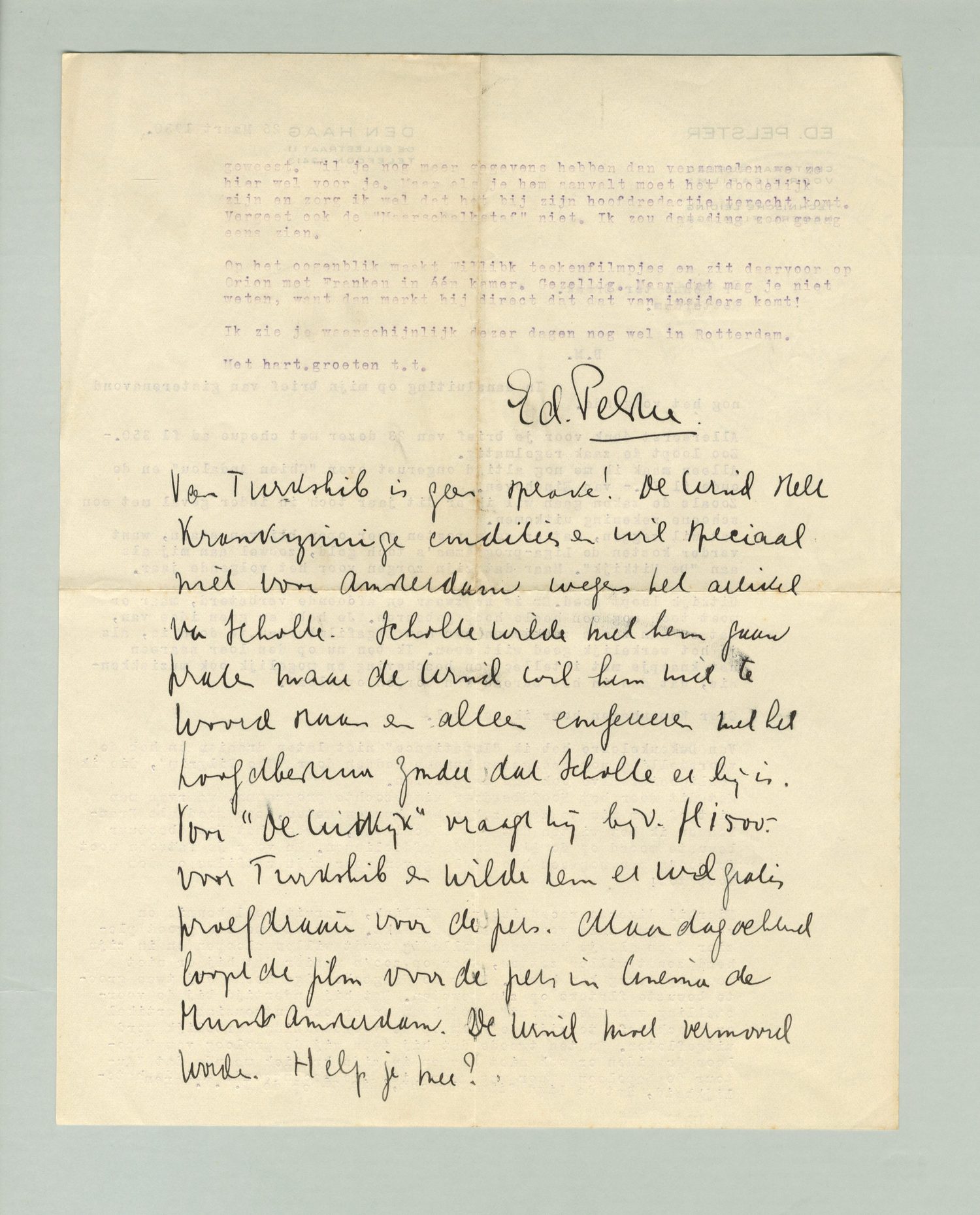 Van Turkshib is geen sprake! De Wind stelt krankzinnige condities en wil speciaal niet voor Amsterdam wegens het artikel van Scholte. Scholte wilde met hem gaan praten maar de Wind wil hem niet te woord staan en alleen confereeren met het hoofdbestuur zonder dat Scholte er bij is. Voor ‘De Uitkijk’ vraagt hij bijv. fl 1500.- voor Turkshib en wilde hem er wel gratis proefdraaien voor de pers. Maandagochtend loopt de film voor de pers in Cinema de Munt Amsterdam. De Wind moet vermoord worden. Help je mee?