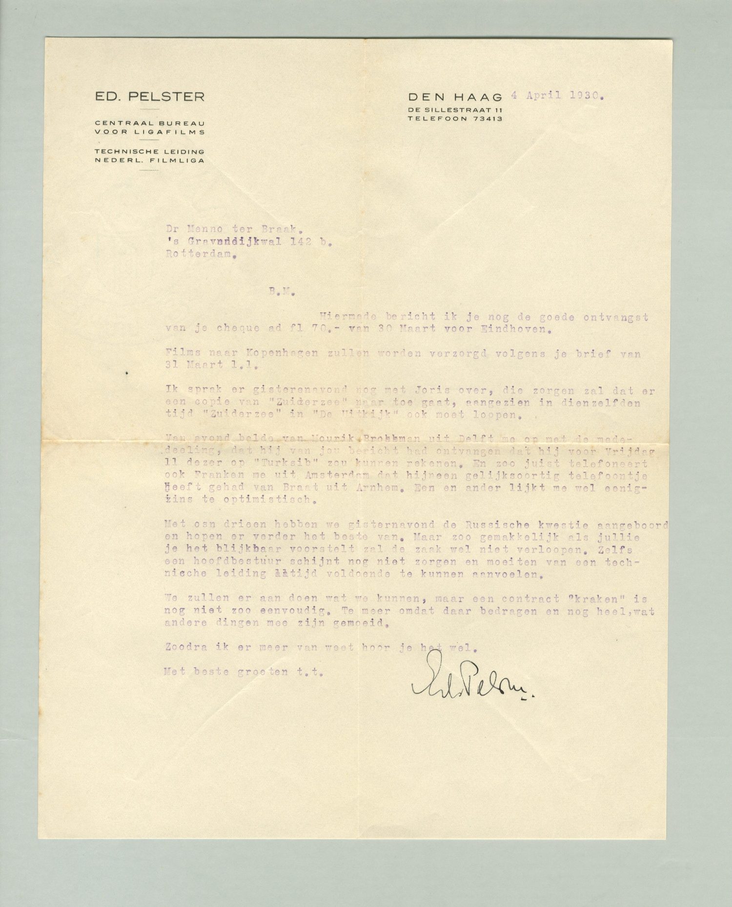 Van avond belde van Mourik Broekman uit Delft me op met de mededeeling, dat hij van jou bericht had ontvangen dat hij voor Vrijdag l.l. dezer op Turksib zou kunnen rekenen. En zoo juist telefoneert ook Franken me uit Amsterdam dat hij een gelijksoortig telefoontje heeft gehad van Braat uit Arnhem. Een en ander lijkt me wel eenigzins te optmistisch.