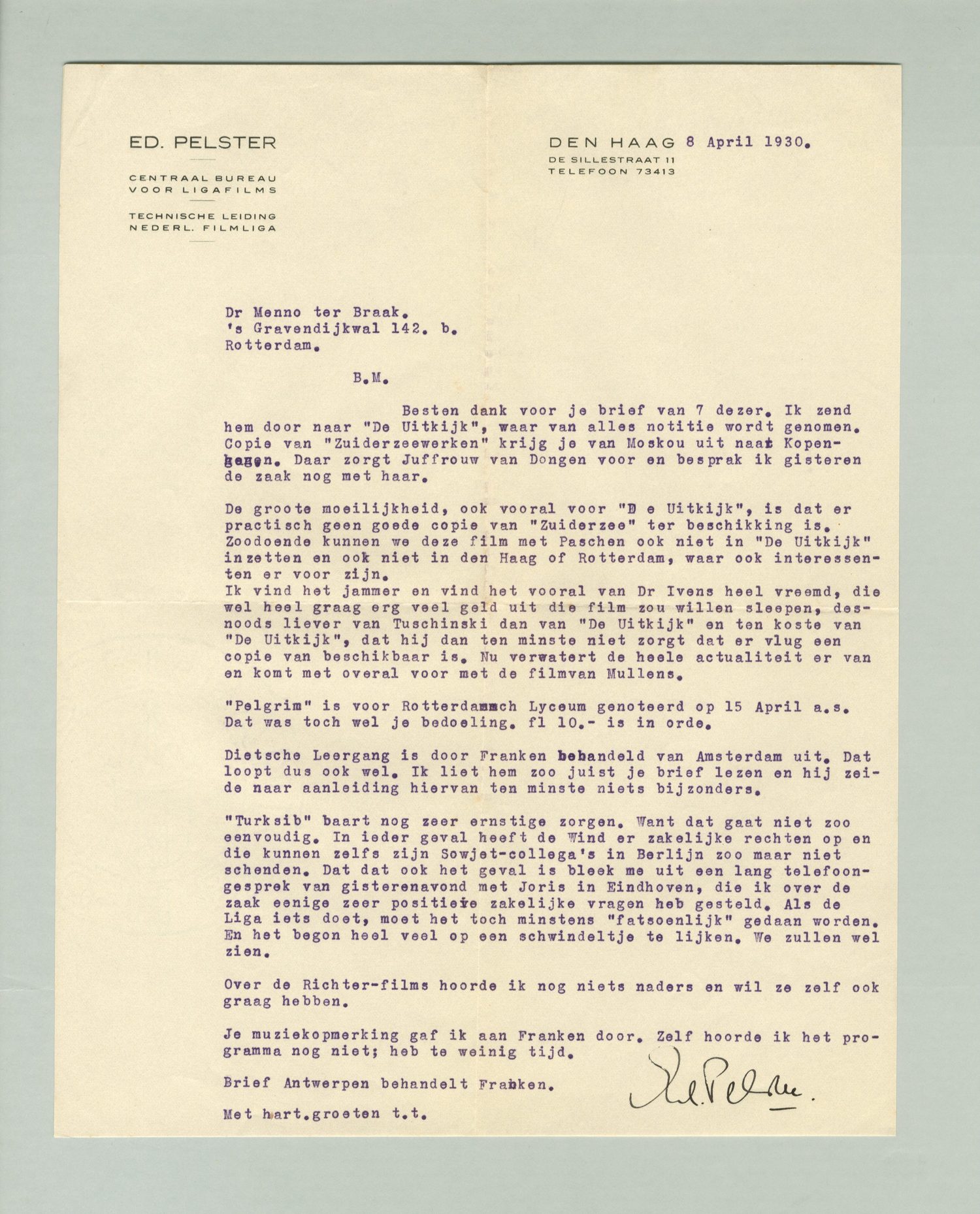 De groote moeilijkheid, ook vooral voor ‘De Uitkijk’, is dat er practisch geen goede copie van Zuiderzee ter beschikking is. Zoodoende kunnen we deze film met Paschen ook niet in ‘De Uitkijk’ inzetten en ook niet in den Haag of Rotterdam, waar ook interessenten er voor zijn.
