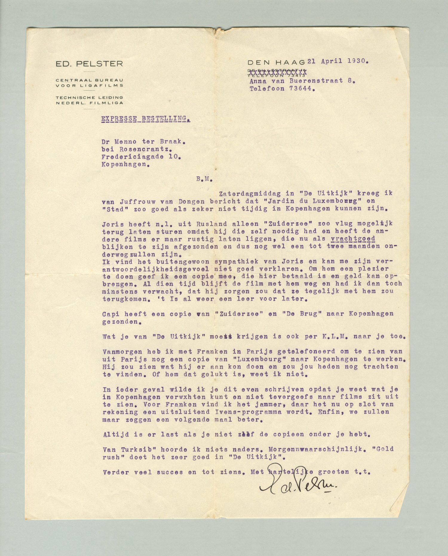 In ieder geval wilde ik je dit even schrijven opdat je weet wat je in Kopenhagen verwachten kunt en niet tevergeefs naar films zit uit te zien. Voor Franken vind ik het jammer, daar het nu op slot van rekening een uitsluitend Ivens-programma wordt. Enfin, we zullen maar zeggen een volgende maal beter.