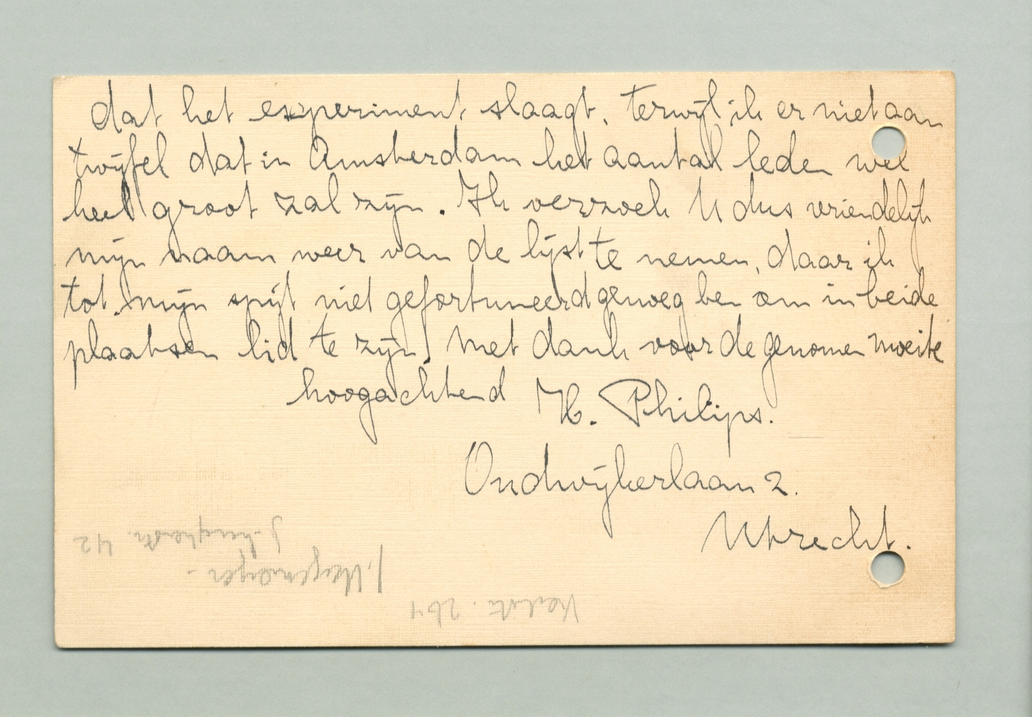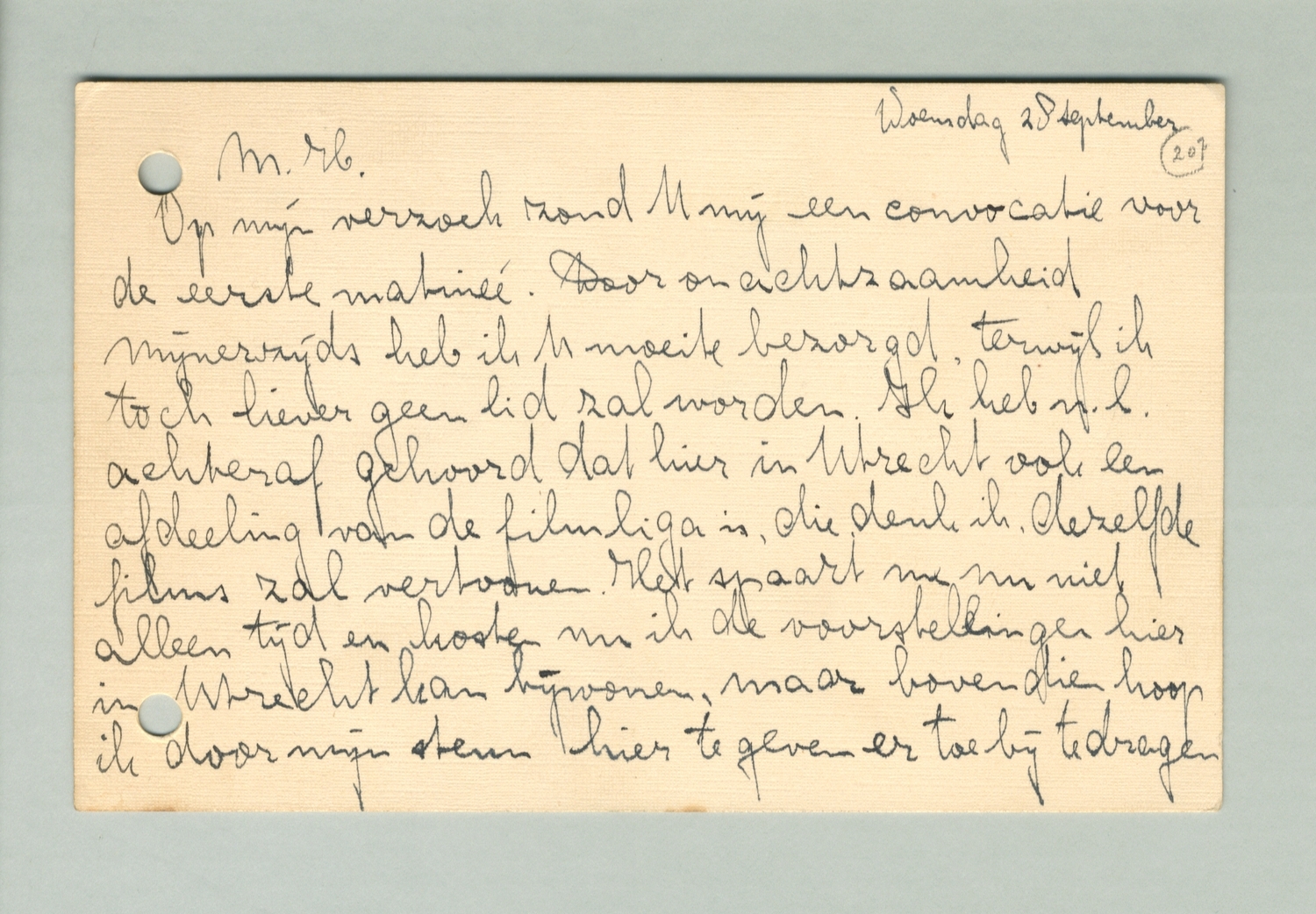 Op mijn verzoek zond U mij een convocatie voor de eerste matinée. Door onachtzaamheid mijnerzijds heb ik U moeite bezorgd, terwijl ik toch liever geen lid zal worden. Ik heb n.l. achteraf gehoord dat hier in Utrecht ook een afdeeling van de filmliga is die, denk ik, dezelfde films zal vertoonen. Het spaart me nu niet alleen tijd en kosten nu ik de voorstellingen hier in Utrecht kan bijwonen, maar bovendien hoop ik door mijn steun hier te geven er toe bij te dragen dat het experiment slaagt, terwijl ik er niet aan twijfel dat in Amsterdam het aantal leden wel heel groot zal zijn. Ik verzoek U dus vriendelijk mijn naam weer van de lijst te nemen, daar ik tot mijn spijt niet gefortuneerd genoeg ben om in beide plaatsen lid te zijn.