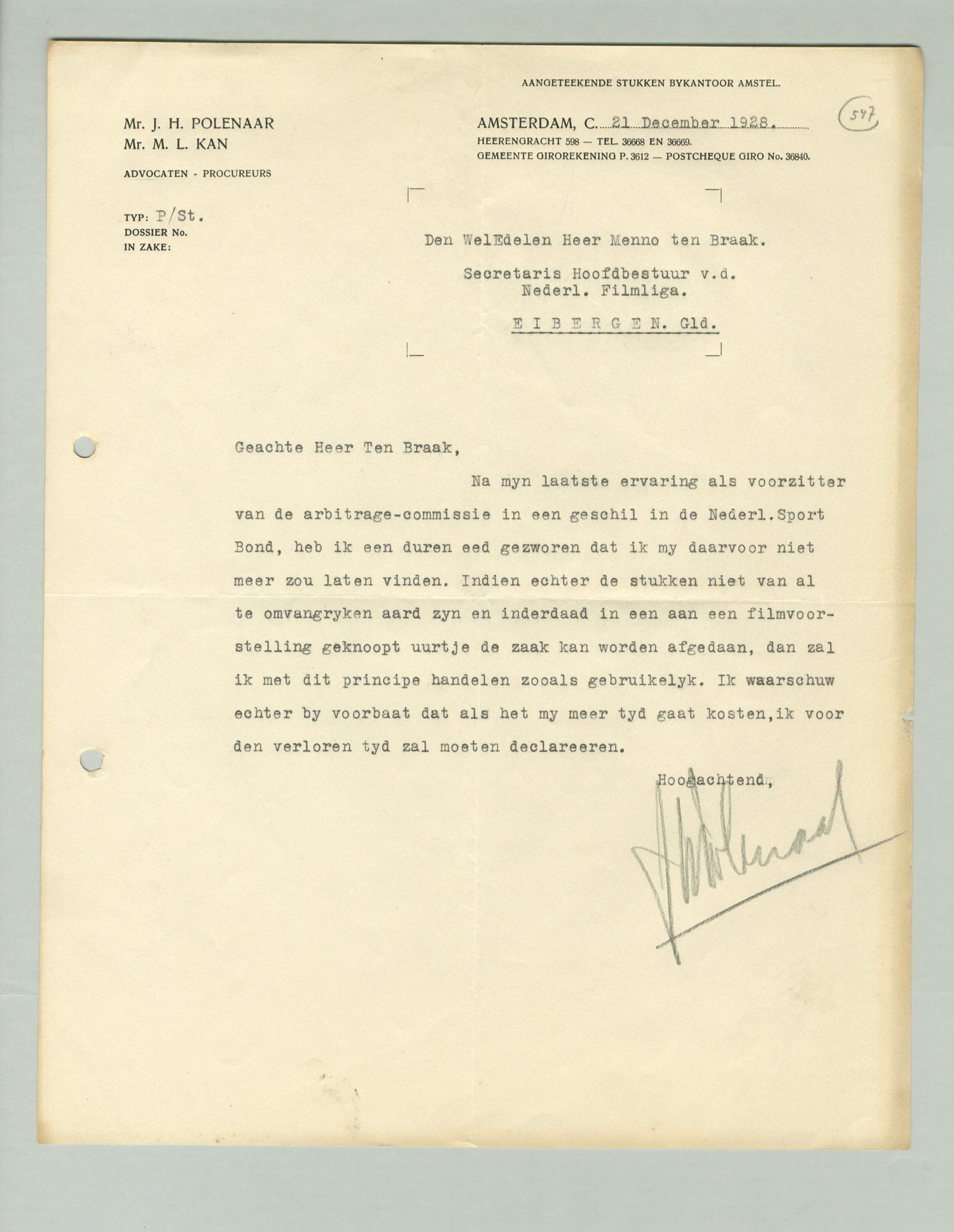Na mijn laatste ervaring als voorzitter van de arbitrage-commissie in een geschil in de Nederl. Sport Bond, heb ik een duren eed gezworen dat ik mij daarvoor niet meer zou laten vinden. Indien echter de stukken niet van al te omvangrijken aard zijn en inderdaad in een aan een filmvoorstelling geknoopt uurtje de zaak kan worden afgedaan, dan zal ik met dit principe handelen zooals gebruikelijk. Ik waarschuw echter bij voorbaat dat als het mij meer tijd gaat kosten, ik voor den verloren tijd zal moeten declareeren.