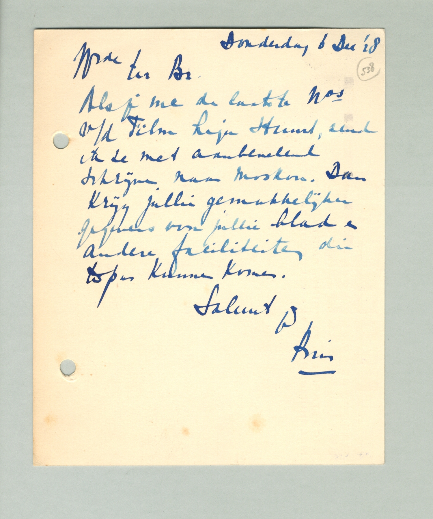 Als je me de laatste nrs v/d Film Liga stuurt, dan zend ik ze met aanbevelend schrijven naar Moskou. Dan krijg jullie gemakkelijker gegevens voor jullie blad en andere faciliteiten die te pas kunnen komen.