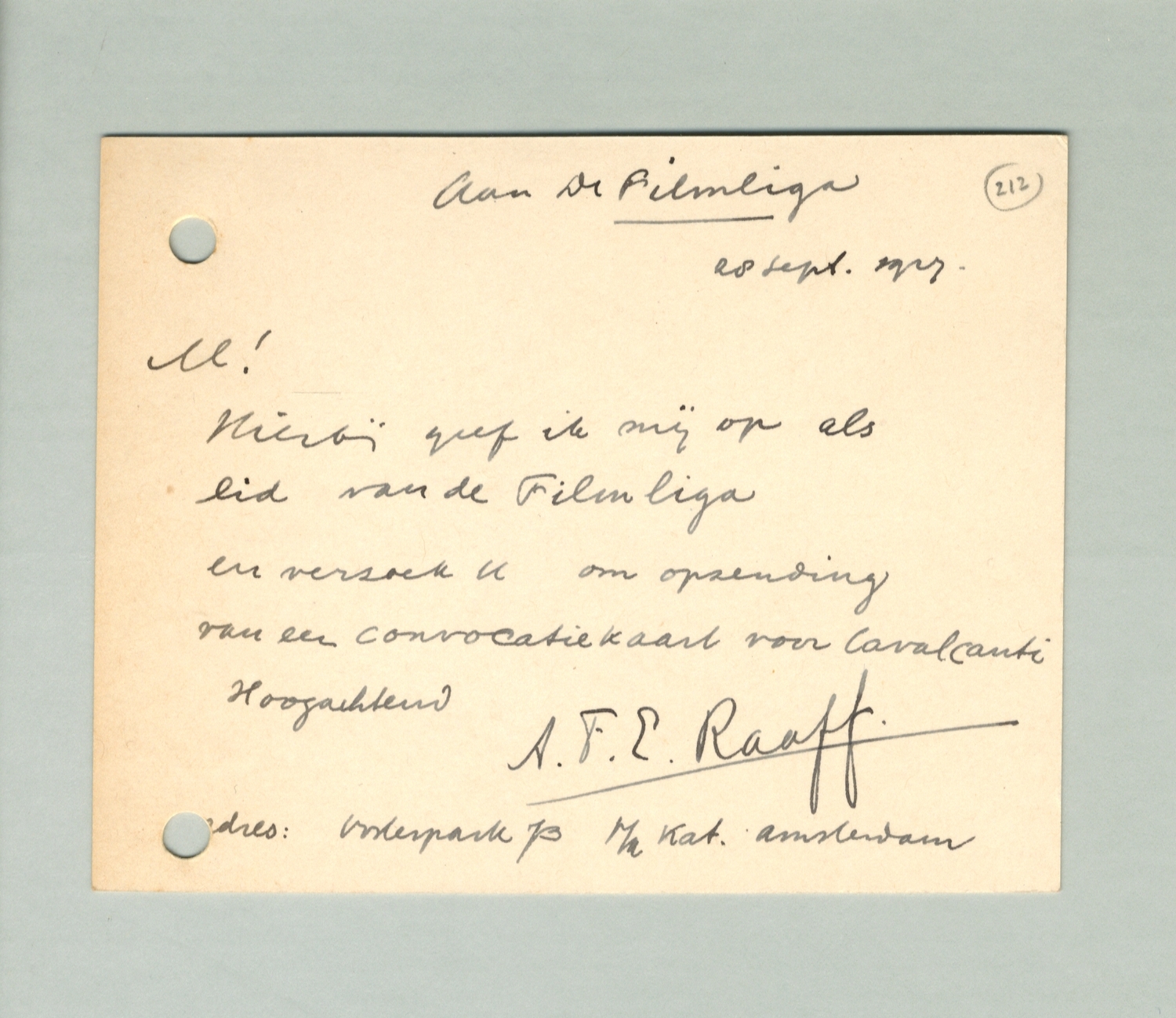 Hierbij geef ik mij op als lid van de Filmliga en verzoek U om opzending van een convocatiekaart voor Cavalcanti.