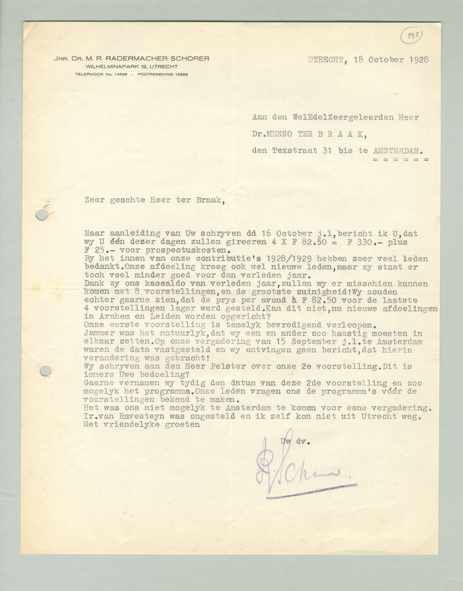 Dank zij ons kassaldo van verleden jaar, zullen wij er misschien kunnen komen met 8 voorstellingen, en de grootste zuinigheid! Wij zouden echter gaarne zien, dat de prijs der avond à F 82.50 voor de laatste 4 voorstellingen lager werd gesteld. Kan dit niet, nu nieuwe afdeelingen in Arnhem en Leiden worden opgericht?