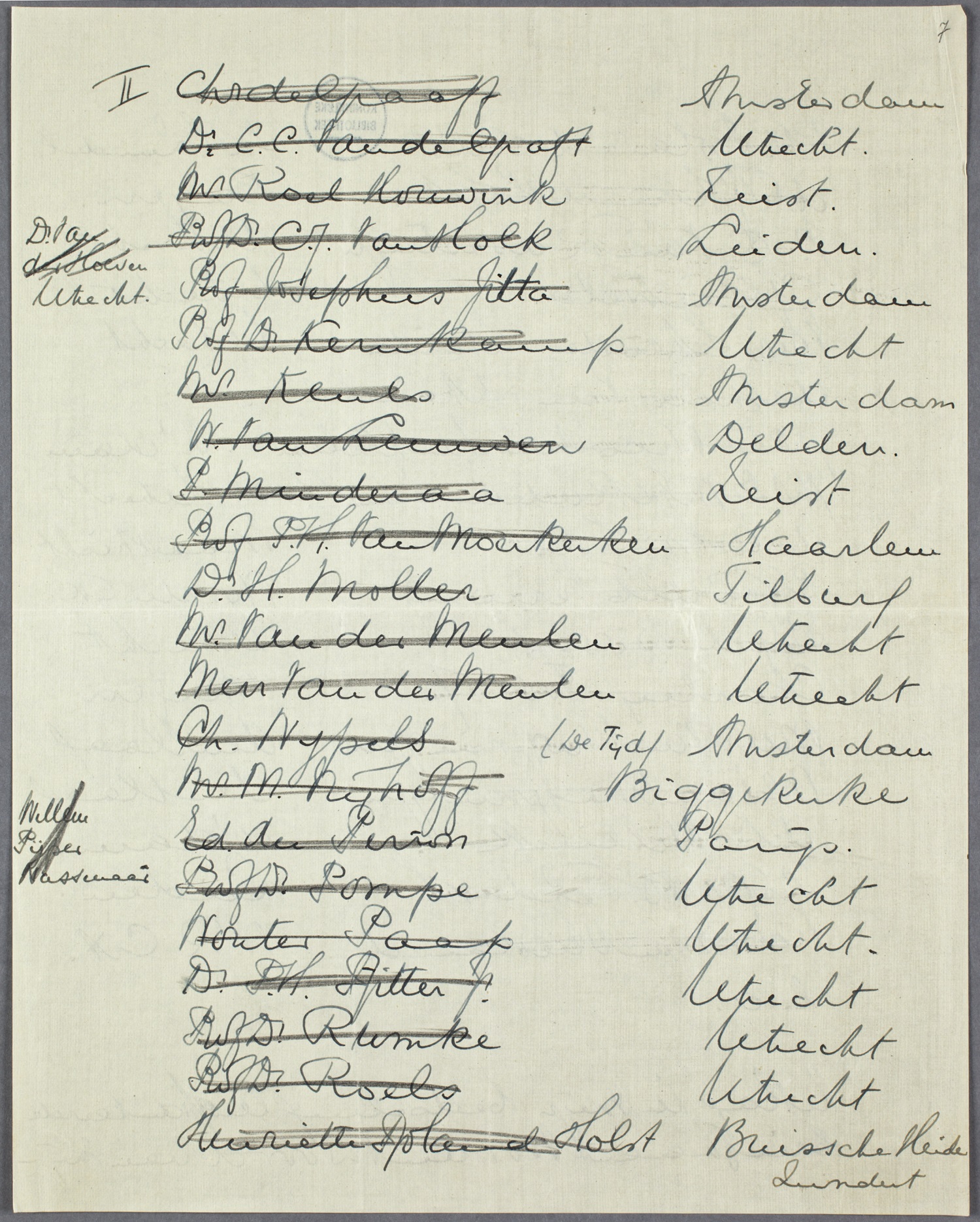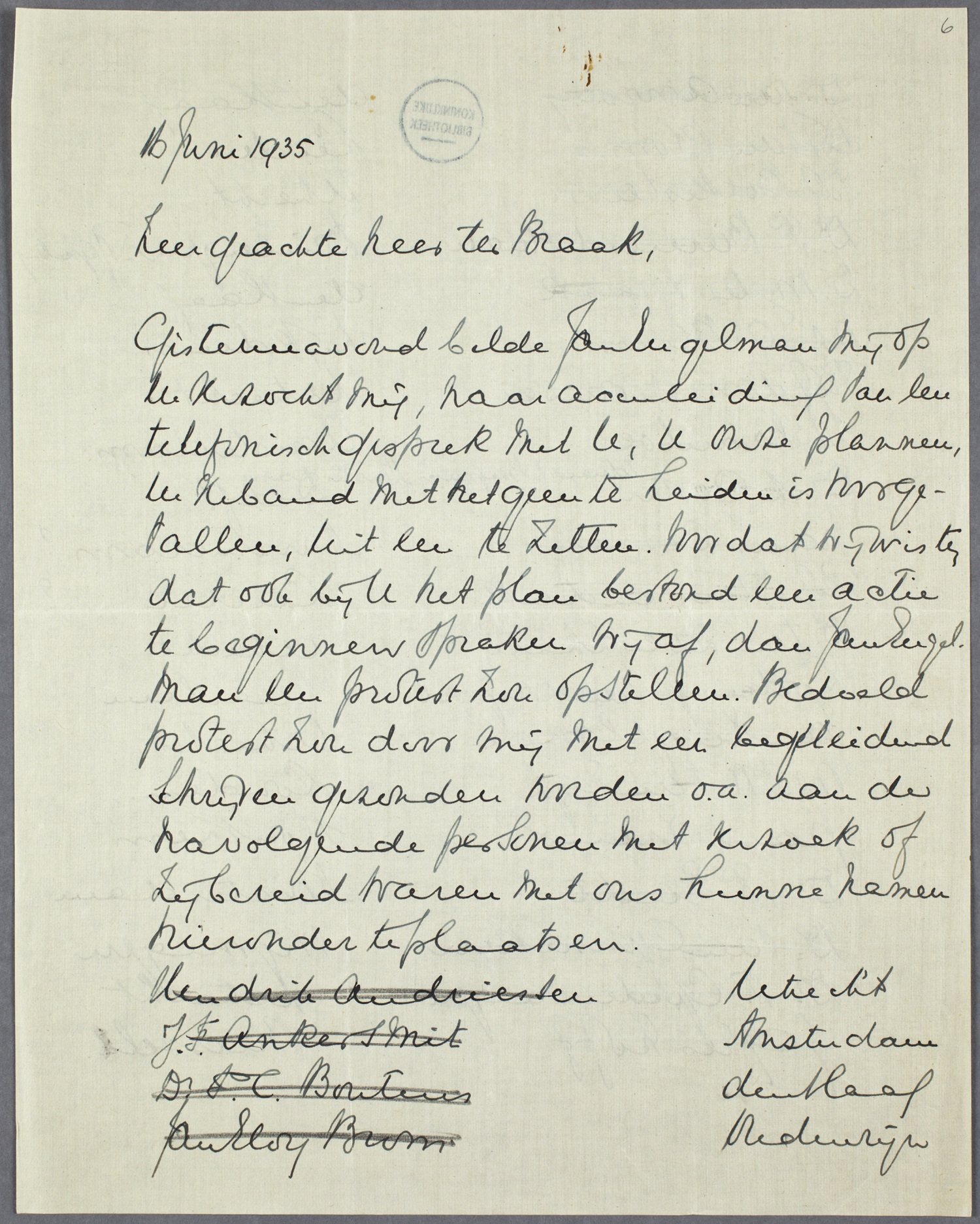 Gisterenavond belde Jan Engelman mij op en verzocht mij, naar aanleiding van een telefonisch gesprek met U, U onze plannen, in verband met hetgeen te Leiden is voorgevallen, uiteen te zetten. Omdat wij wisten dat ook bij U het plan bestond een actie te beginnen spraken wij af, dan Jan Engelman een protest zou opstellen. Bedoeld protest zou door mij met een begeleidend schrijven gezonden worden o.a. aan de navolgende personen met verzoek of zij bereid waren met ons hunne namen hieronder te plaatsen.
