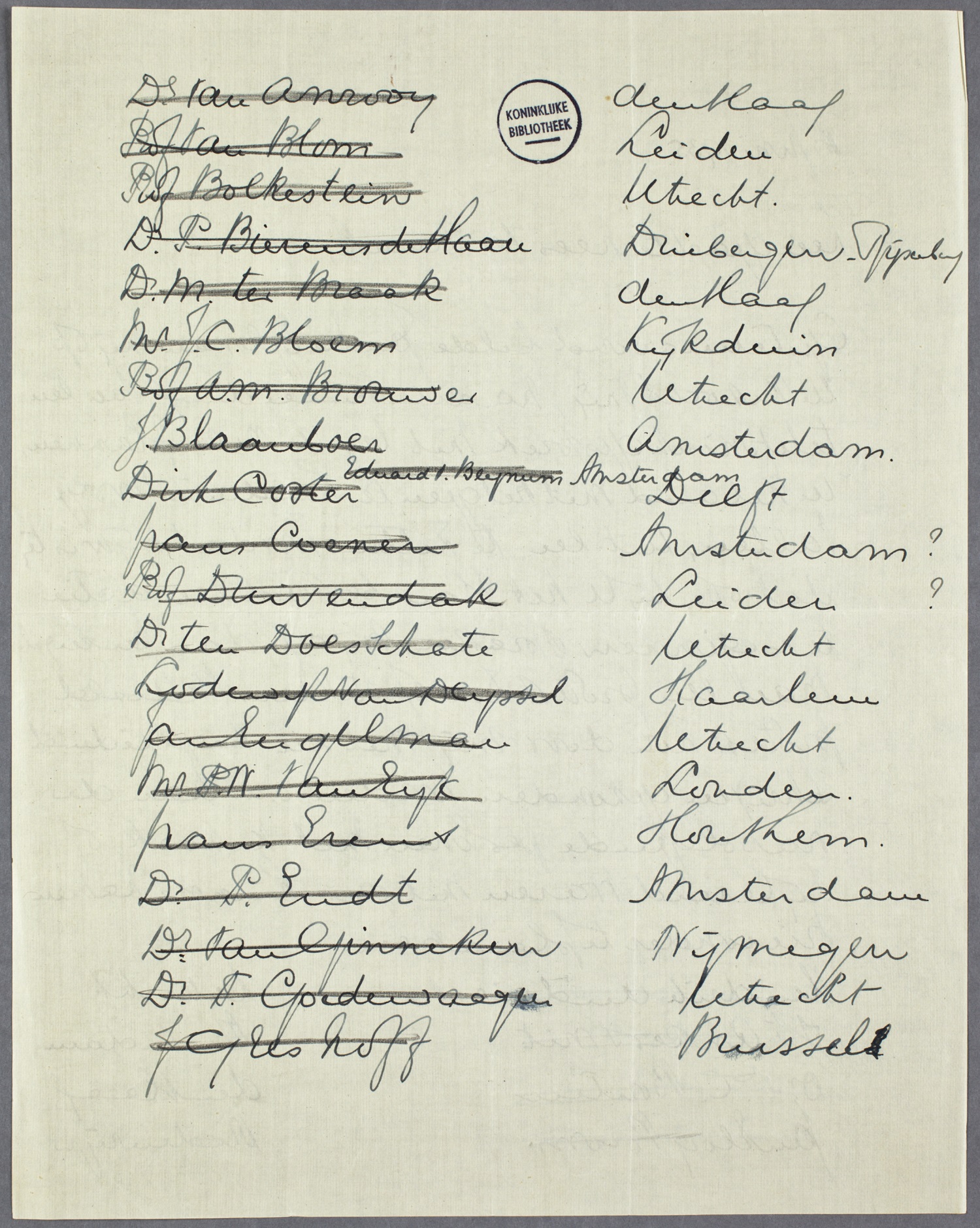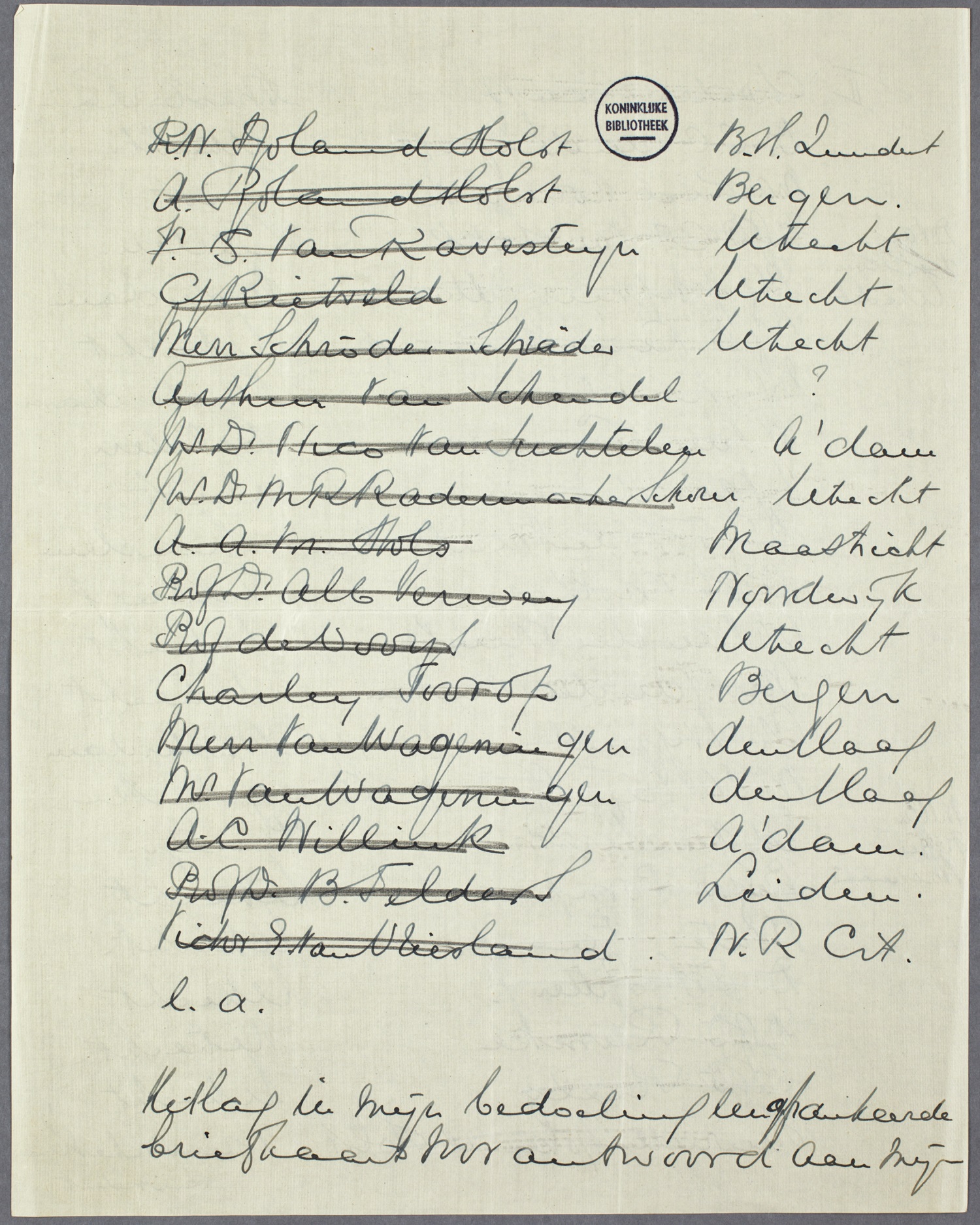 Snel handelen scheen ons gewenscht. Wij wilden trachten niet alleen de medewerking te [ ] krijgen van de naaste vrienden van Marsman en een groep letterkundigen, maar ook een [ ] van verschillende personen uit geheel andere milieu’s, hetgeen U uit de hierboven genoemde namen zal blijken. (Naar onze meening slaagden wij er nog niet volkomen in, maar de lijst was ook voor aanvulling vatbaar!) Persoonlijk overwoog ik de wenschelijkheid, bij het protest een [verzoek] aan de lezers te richten, gelden bij een van ons te [ ] om aan M. later te kunnen overhandigen, nu hem een bedrag van F 1000.- geheel ten onrechte is ontgaan. (gelden die hij in zijn tegenwoordige omstandigheden uitstekend kan gebruiken!) Dit voornemen werkte ik echter niet uit, omdat ik vreesde dat het succes gering zou zijn. (ik meen dat Uw meening een andere is?)