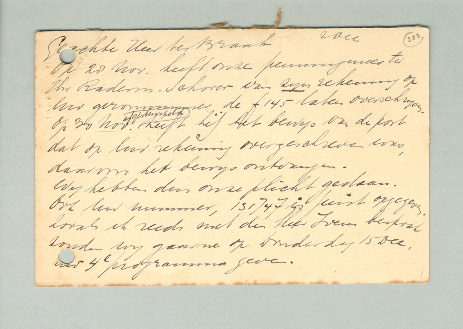 Op 28 Nov. heeft onze penningmeester Jhr Raderm.Schorer van zijn rekening op Uw gironummer de f.145 laten overschrijven. Op 30 Nov. afgestempeld heeft hij het bewijs van de post dat op Uw rekening overgeschreven was, daarvoor het bewijs ontvangen.