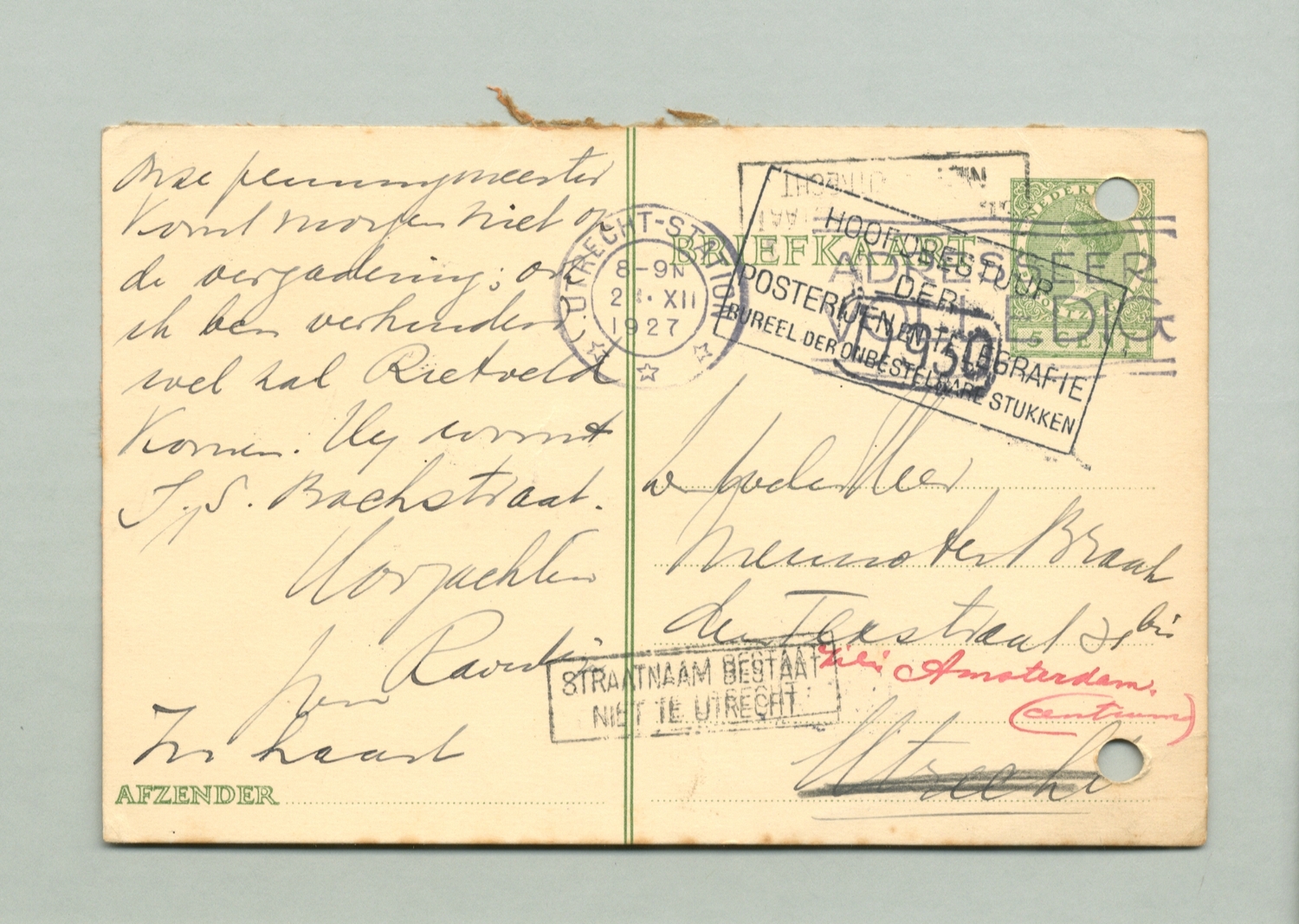 Onze penningmeester komt morgen niet op de vergadering; ook ik ben verhinderd; wel zal Rietveld komen. Hij woont J.S. Bachstraat.