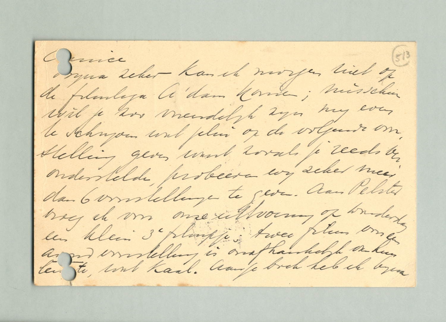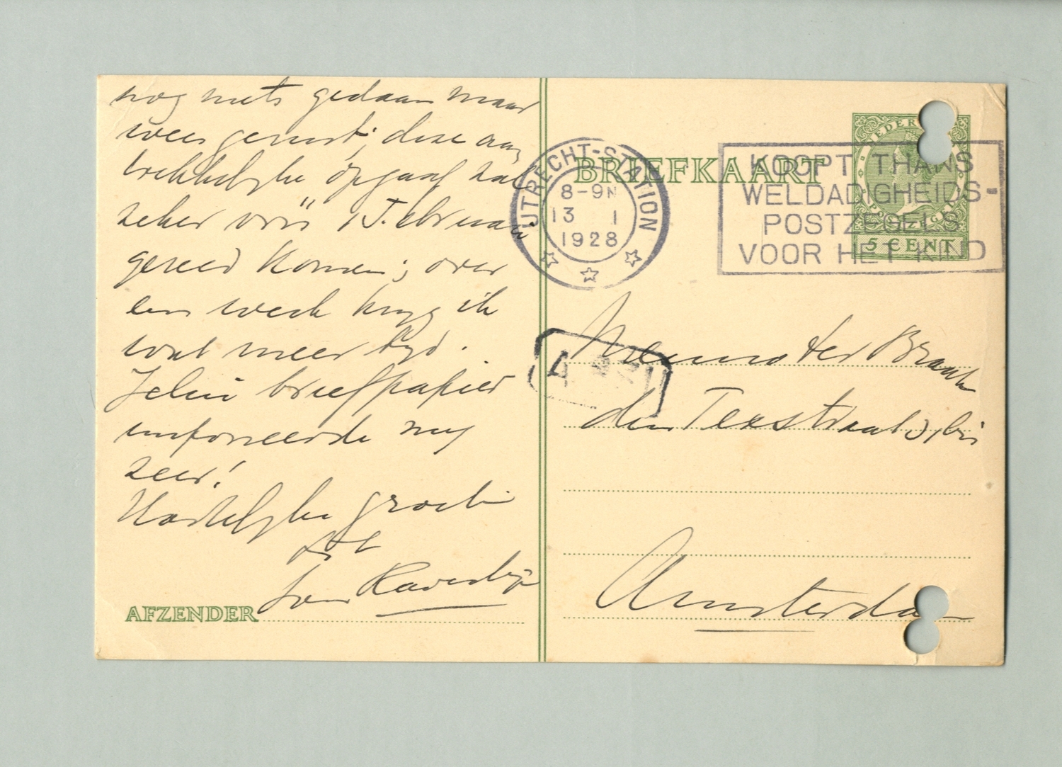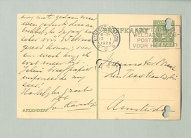 Bijna zeker kan ik morgen niet op de Filmliga A'dam komen; misschien wil je zoo vriendelijk zijn mij even te schrijven wat jelui op de volgende voorstelling geven want zooals je reeds veronderstelde, probeeren wij zeker meer dan 6 voorstellingen te geven. Aan Pelster vroeg ik voor onze uitvoering op Donderdag een klein 3e filmpje; twee films voor een avondvoorstelling is onafhankelijk van hun lengte wat kaal. Aan je boek heb ik bijna nog niets gedaan maar weest gerust; deze aantrekkelijke opgaaf zal zeker vóór 1 Februari gereed komen; over een week krijg ik wat meer tijd. Jelui briefpapier imponeerde mij zeer!
