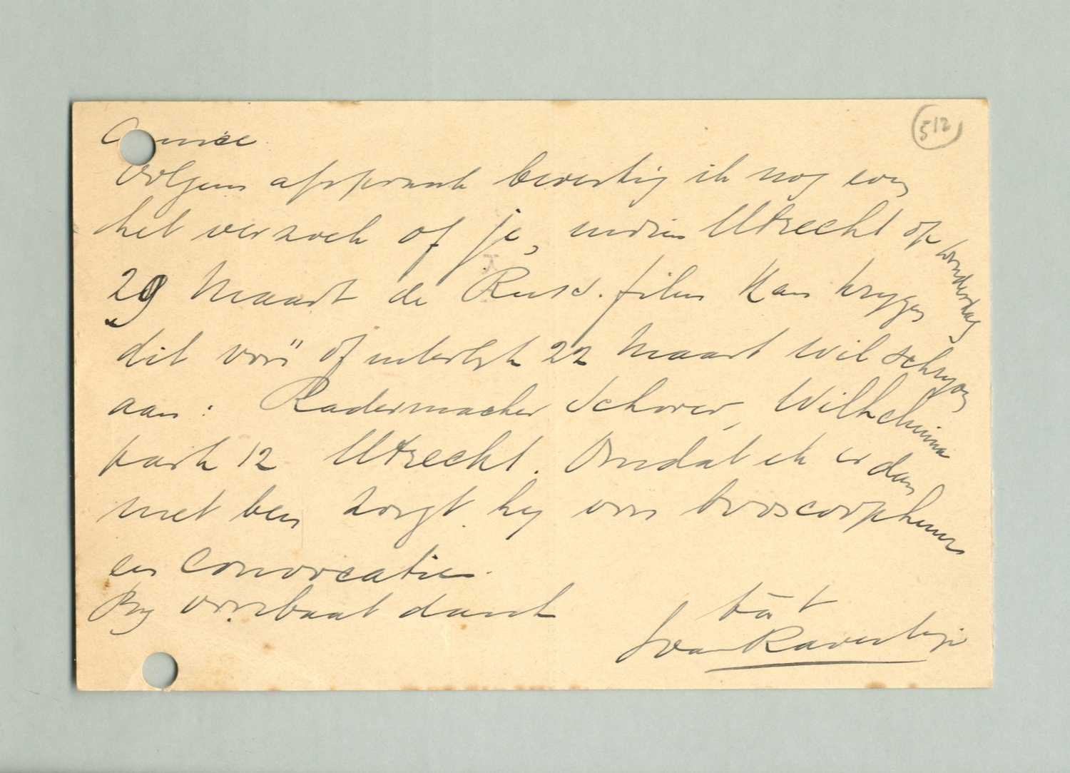 Volgens afspraak bevestig ik nog even het verzoek of je, indien Utrecht op Donderdag 29 Maart de Russ. film kan krijgen dit vóór of uiterlijk 22 Maart wil schrijven aan: Radermacher Schorer, Wilhelminapark 12 Utrecht. Omdat ik er dan niet ben zorgt hij voor bioscoophuur en convocaties.