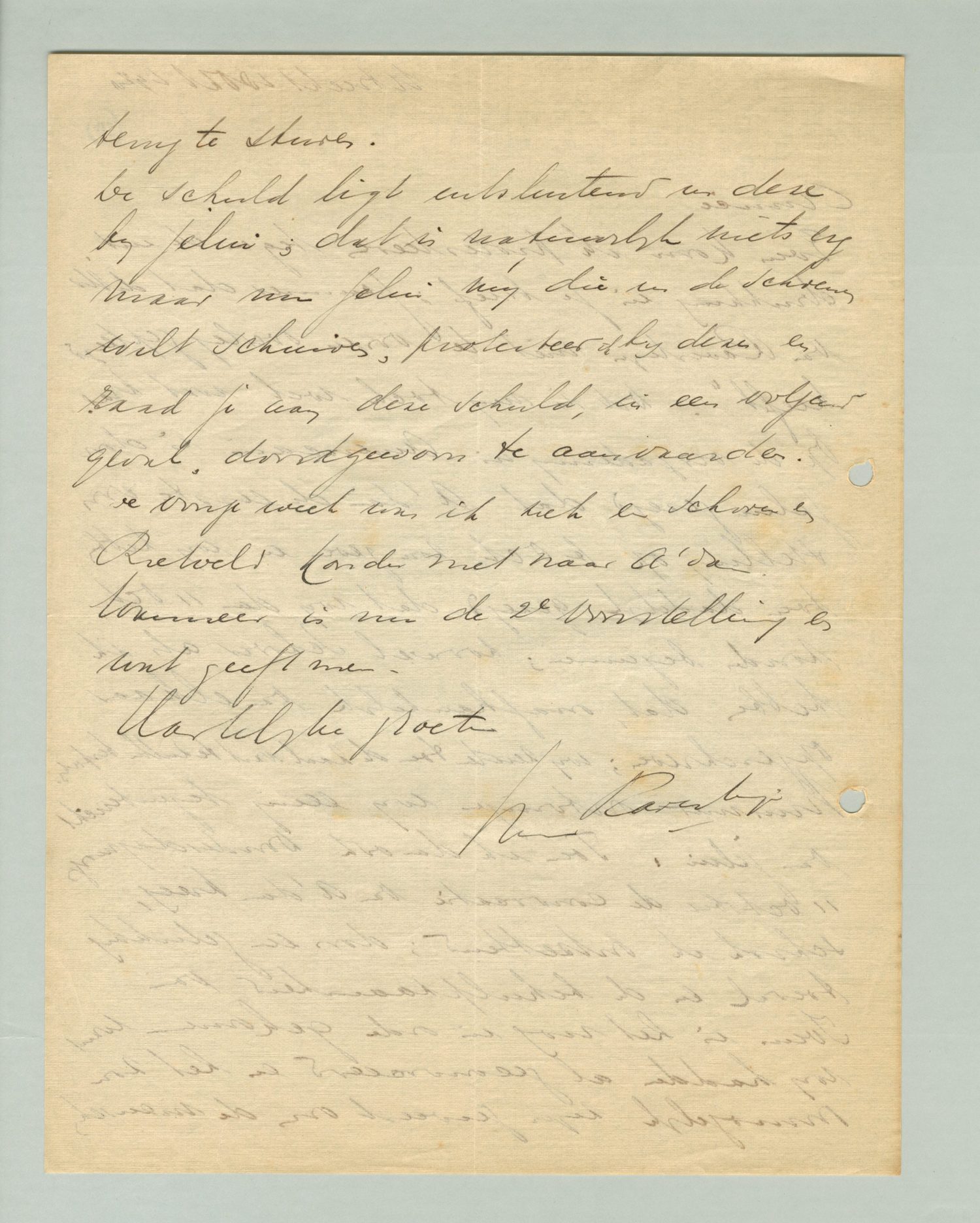 Even kom ik protesteeren tegen de uitdrukking in je brief: ‘jammer dat de Hr. van Ravesteyn niet te voren overleg gepleegd heeft’. Dit is mij toch wel wat kras. Op de vergadering in Americain is door jelui gezegd dat A'dam de eerste voorstelling op 6 Oct zou geven en wij hebben toen dadelijk gezegd dat wij dan 11 Oct zouden beginnen; zoowel Schorer als ik hebben dat, onafhankelijk van elkaar opgeschreven; wij zij zeiden toen de zaal vast te zullen bespreken. Nimmer ontvingen wij eenig tegenbericht van jelui. Toen ik dan ook Donderdagmorgen 11 october de convocatie van A'dam kreeg, schrok ik ontzettend; door een gelukkig toeval en de behulpzaamheid dan Ivens is het toch nog in orde gekomen want wij hadden al geconvoceerd en het zou onmogelijk zijn geweest om de menschen terug te sturen.