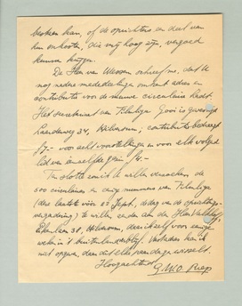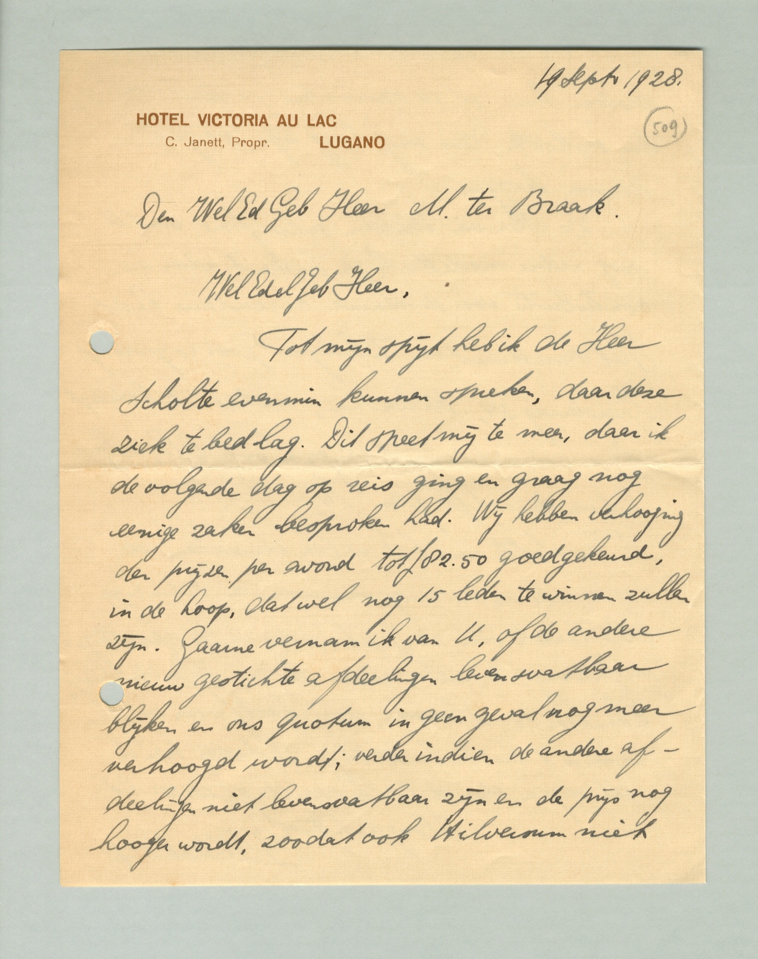Tot mijn spijt heb ik de Heer Scholte evenmin kunnen spreken, daar deze ziek te bed lag. Dit speet mij te meer, daar ik de volgende dag op reis ging en graag nog eenige zaken besproken had. Wij hebben verhooging der prijzen per avond tot f 82.50 goedgekeurd, in de hoop, dat wel nog 15 leden te winnen zullen zijn. Gaarne vernam ik van U, of de andere nieuw gestichte afdeelingen levensvatbaar blijken en ons quotum in geen geval nog meer verhoogd wordt; verder indien de andere afdeelingen niet levensvatbaar zijn en de prijs nog hooger wordt, zoodat ook Hilversum niet bestaan kan, of de oprichters een deel van hun onkosten, die vrij hoog zijn, vergoed kunnen krijgen.
