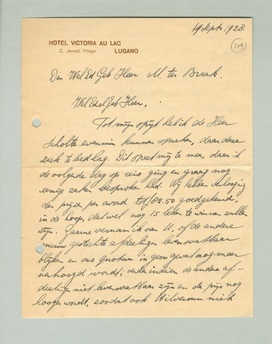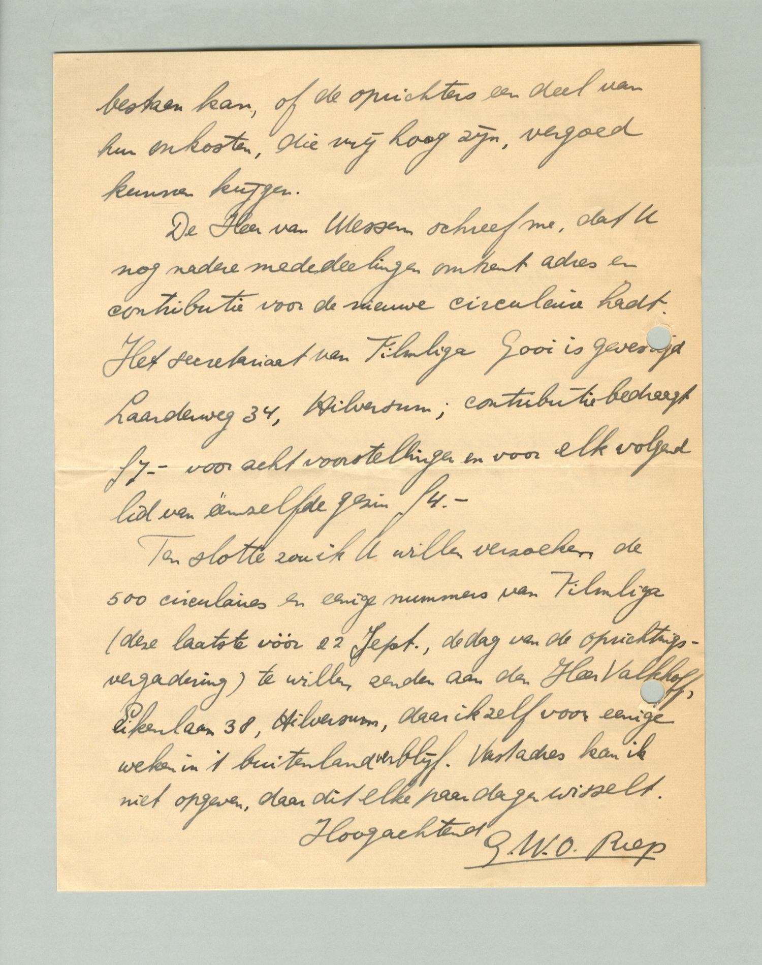 Tenslotte zou ik U willen verzoeken de 500 circulaires en eenige nummers van Filmliga (deze laatste voor 22 Sept., de dag van de oprichtingsvergadering) te willen zenden aan den Heer Valkhoff, Eikenlaan 38, Hilversum, daar ik zelf voor eenige weken in 't buitenland verblijf. Vast adres kan ik niet opgeven, daar dit elke paar dagen wisselt.