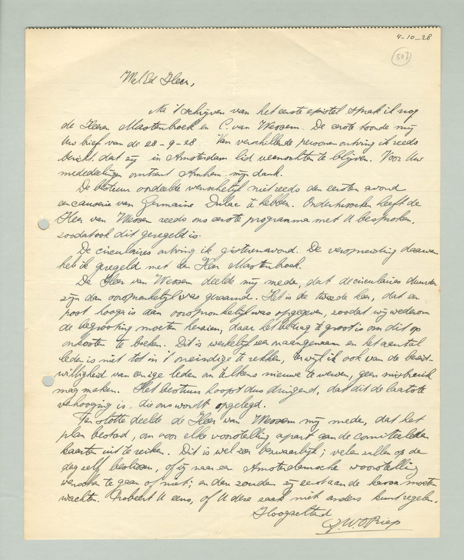 Na 't schrijven van het eerste epistel sprak ik nog de Heeren Mastenbroek en C. van Wessem. De eerste toonde mij Uw brief van 28-9-28. Van verschillende personen ontving ik reeds bericht dat zij in Amsterdam lid wenschten te blijven. Voor Uw mededeelingen omtrent Arnhem mijn dank.
