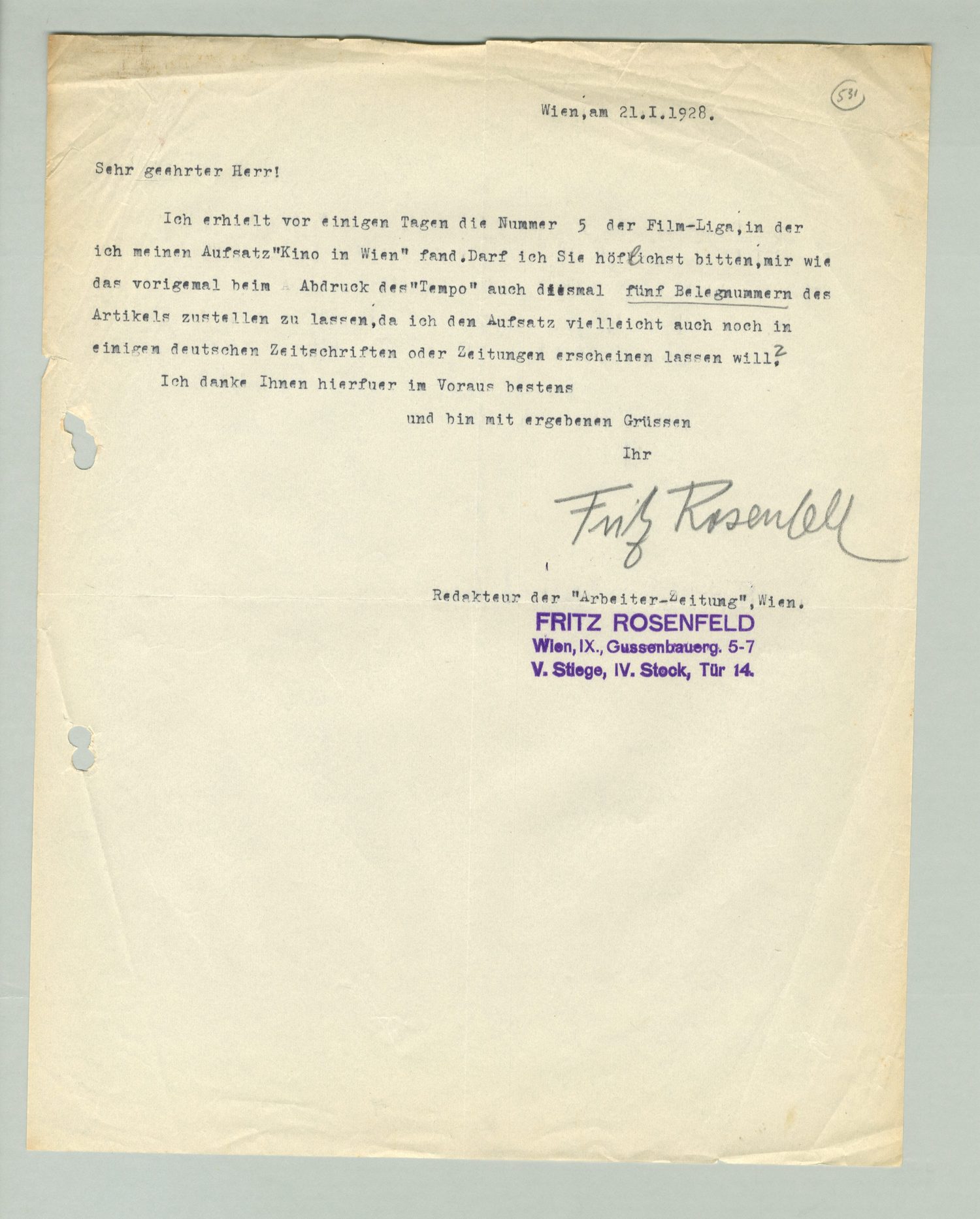 Ich erhielt vor einigen Tagen die Nummer 5 der Film-Liga, in der ich meinen Aufsatz ‘Kino in Wien’ fand. Darf ich Sie höflichst bitten, mir wie das vorigemal beim Abdruck des ‘Tempo’ auch diesmal fünf Belegnummern des Artikels zustellen zu lassen, da ich den Aufsatz vielleicht auch noch in einigen deutschen Zeitschriften oder Zeitungen erscheinen lassen will?
