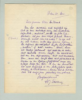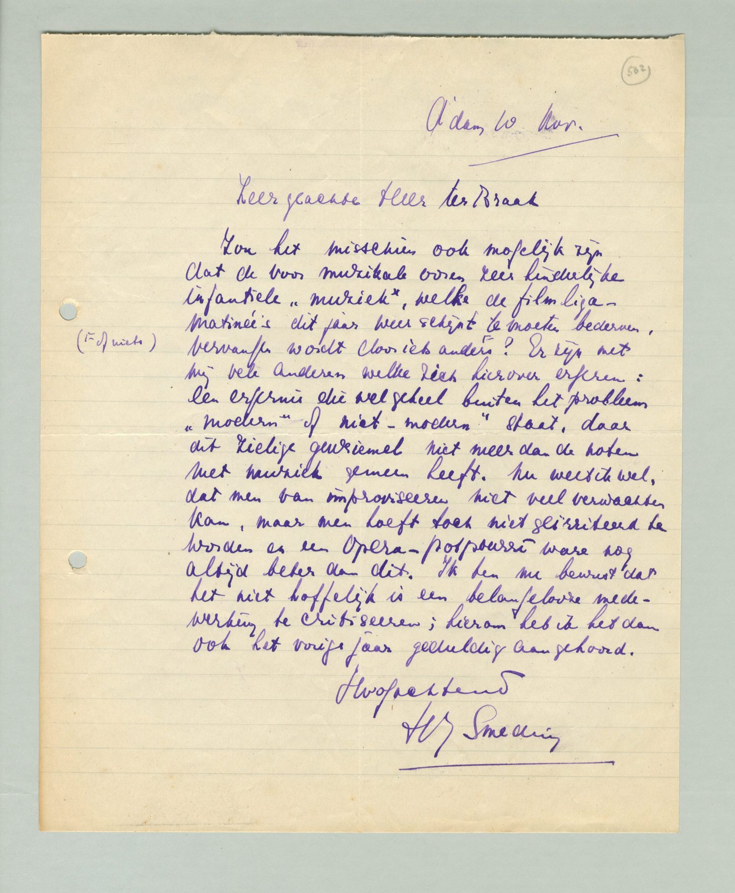 Zou het misschien ook mogelijk zijn dat de voor muzikale ooren zeer hinderlijke infantiele ‘muziek’, welke de filmliga matinée's dit jaar weer schijnt te moeten bederven, vervangen wordt door iets anders (of niets)? Er zijn met mij vele anderen welke zich hierover ergeren: een ergernis die wel geheel buiten het probleem ‘modern’ of ‘niet-modern’ staat, daar dit zielige gewriemel niet meer dan de noten met muziek gemeen heeft. Nu weet ik wel, dat men van improviseeren niet veel verwachten kan, maar men hoeft toch niet geïrriteerd te worden en een opera-potpourri ware nog altijd beter dan dit. Ik ben me bewust dat het niet hoffelijk is een belangelooze medewerking te critiseeren; hierom heb ik het dan ook het vorige jaar geduldig aangehoord.