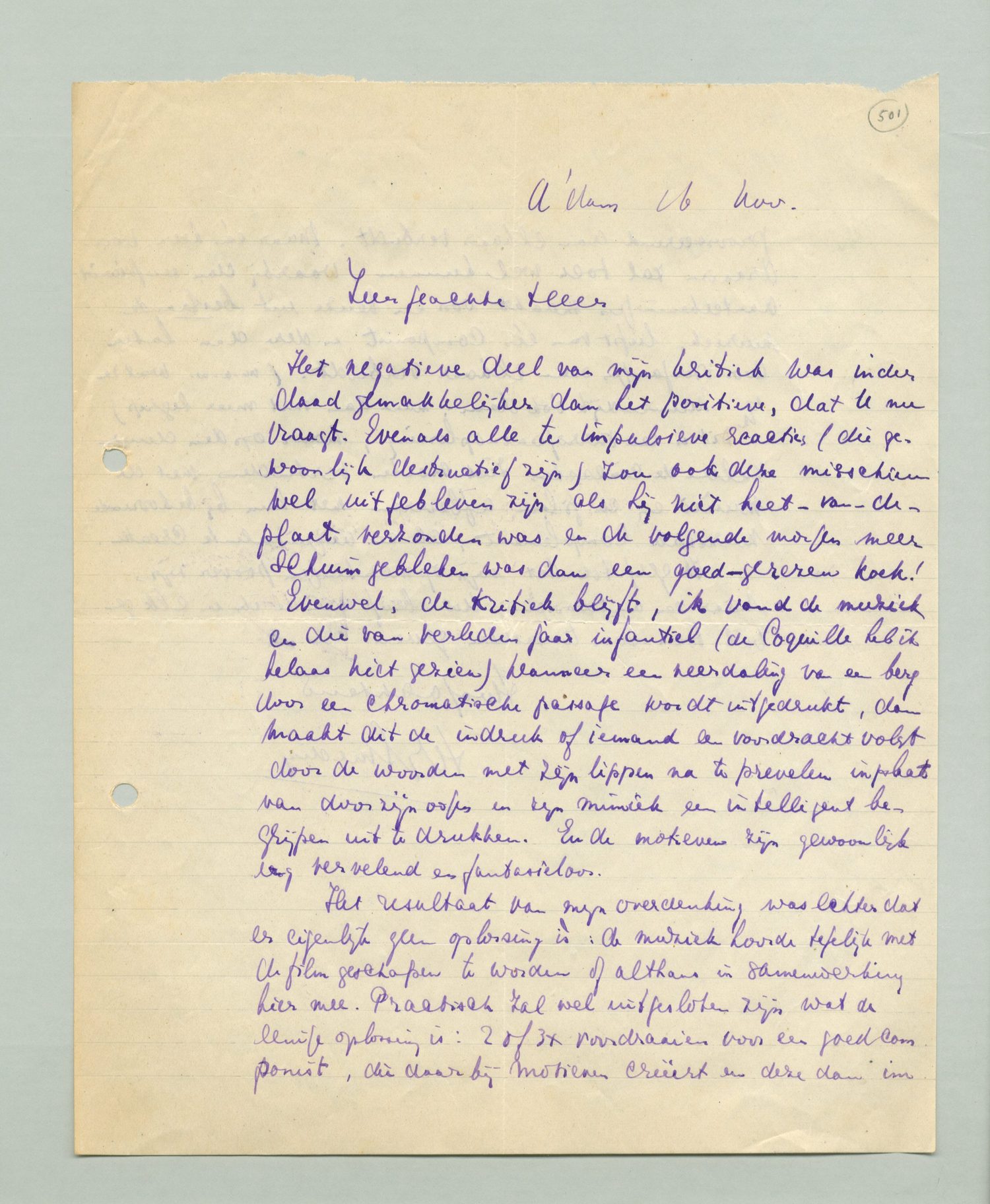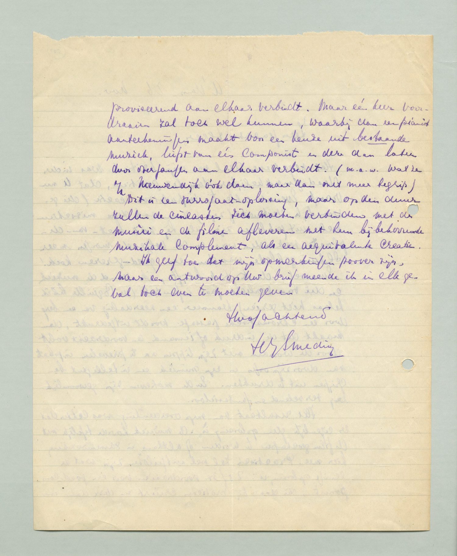 Het resultaat van mijn overdenking was echter dat er eigenlijk geen oplossing is: de muziek hoorde tegelijk met de film geschapen te worden of althans in samenwerking hier mee. Practisch zal wel uitgesloten zijn wat de eenige oplossing is: 2 of 3x voordraaien voor een goed componist, die daarbij motieven creëert en deze dan improviseerend aan elkaar verbindt. Maar één keer voordraaien zal toch wel kunnen, waarbij dan een pianist aanteekeningen maakt voor een keuze uit bestaande muziek, liefst van één componist en deze dan later door overgangen aan elkaar verbindt. (m.a.w. wat ze a/d Nieuwendijk ook doen, maar dan met meer begrip).