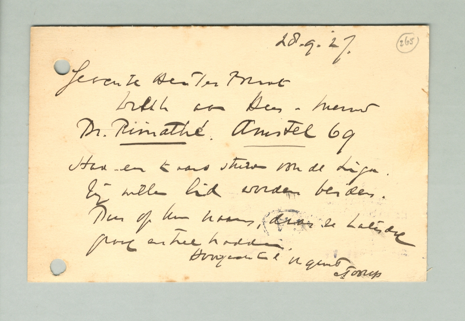 Wilt U aan Heer en Mevrouw Dr. Rimathé, Amstel 69 Stad een kaart sturen voor de Liga. Zij willen lid worden beiden. Dus op hun naam, daar ze Zaterdag graag entree hadden.