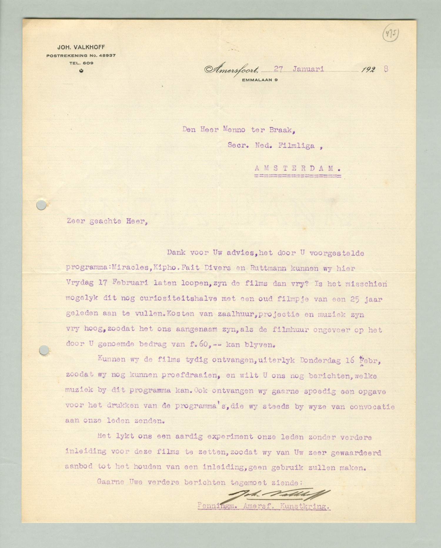 Dank voor Uw advies, het door U voorgestelde programma: Miracles, Kipho, Faits Divers en Ruttmann kunnen wij hier Vrijdag 17 Februari laten loopen, zijn de films dan vrij? Is het misschien mogelijk dit nog curiositeitshalve met een oud filmpje van een 25 jaar geleden aan te vullen? Kosten van zaalhuur, projectie en muziek zijn vrij hoog, zoodat het ons aangenaam zal zijn, als de filmhuur ongeveer op het door U genoemde bedrag van f.60,- kan blijven.