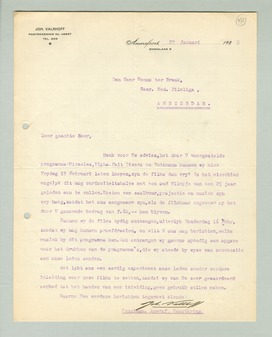 Kunnen wij de films tijdig ontvangen, uiterlijk Donderdag 16 Febr., zoodat wij nog kunnen proefdraaien, en wilt U ons nog berichten, welke muziek bij dit programma kan. Ook ontvangen wij gaarne spoedig een opgave voor het drukken van de programma's, die wij steeds bij wijze van convocatie aan onze leden zenden.