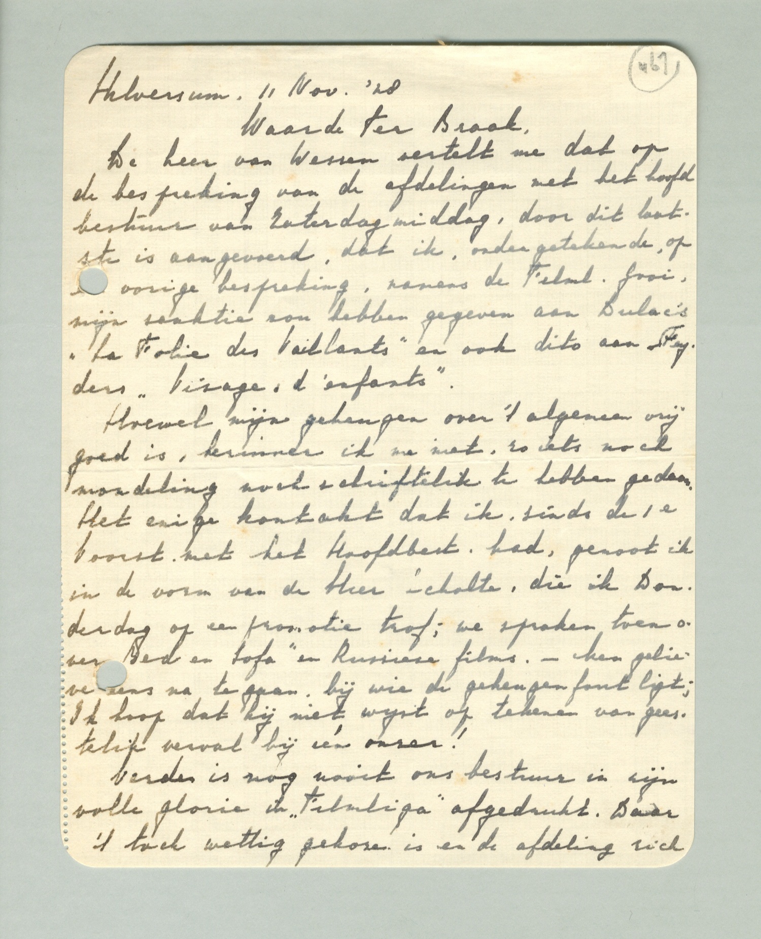De heer van Wessem vertelt me dat op de bespreking van de afdelingen met het hoofdbestuur van Zaterdagmiddag, door dit laatste is aangevoerd, dat ik, ondergetekende, op de vorige bespreking, namens de Filml. Gooi, mijn sanktie zou hebben gegeven aan Dulac's La Folie des Vaillants en ook dito aan Feyders Visages d'enfants.